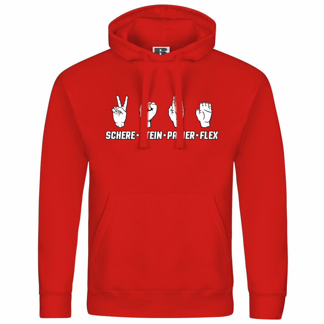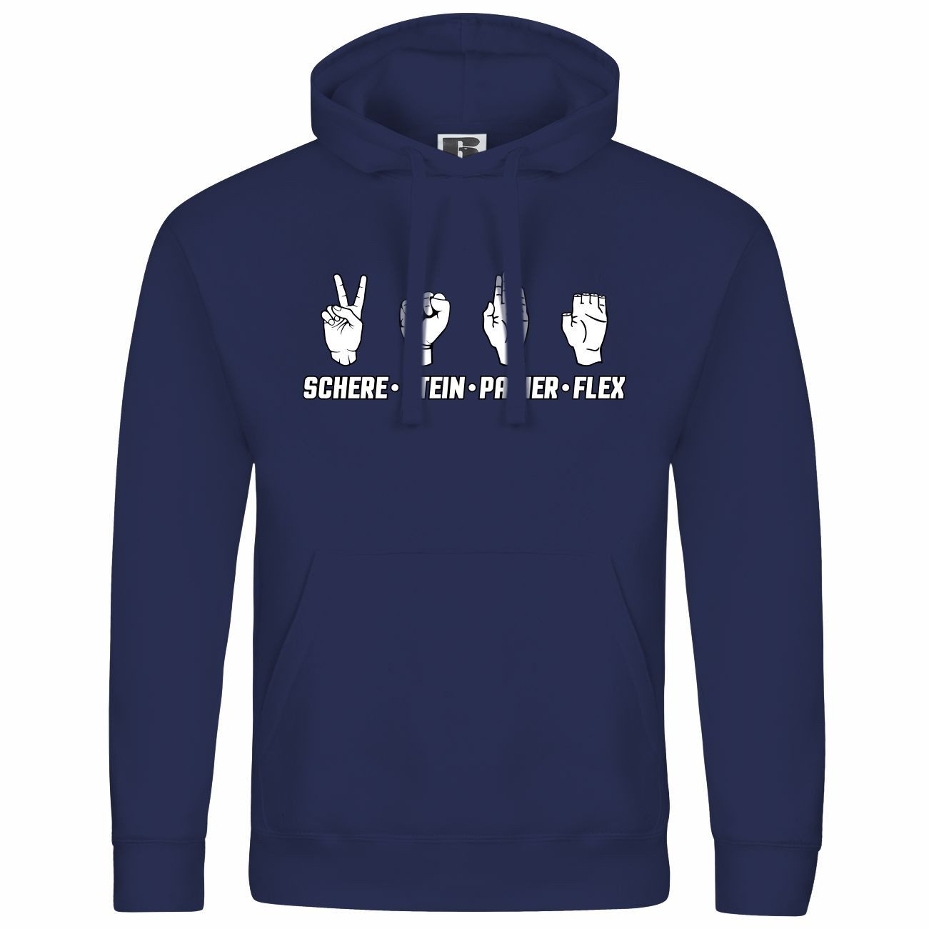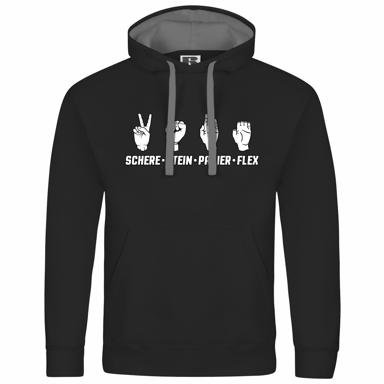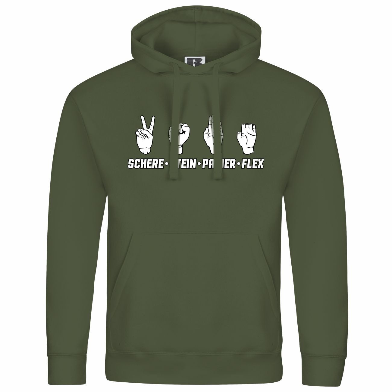 Das Motiv auf dem Kapuzenpullover zeigt die Handzeichen des Spiels „Schere, Stein, Papier“ und ergänzt es humorvoll um „Flex“. Ideal für Fans von lustigen Sprüchen und handwerklichen Berufen!