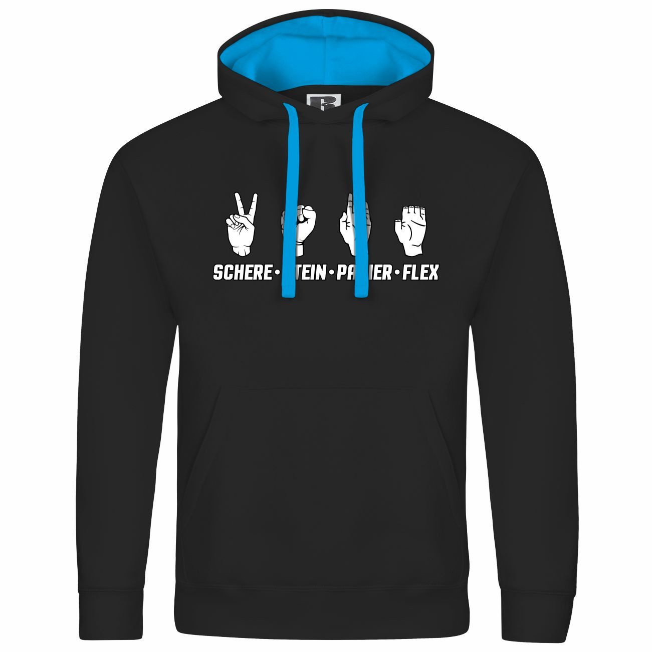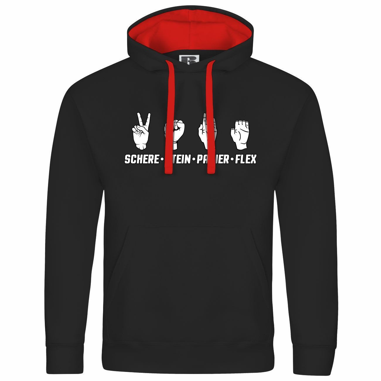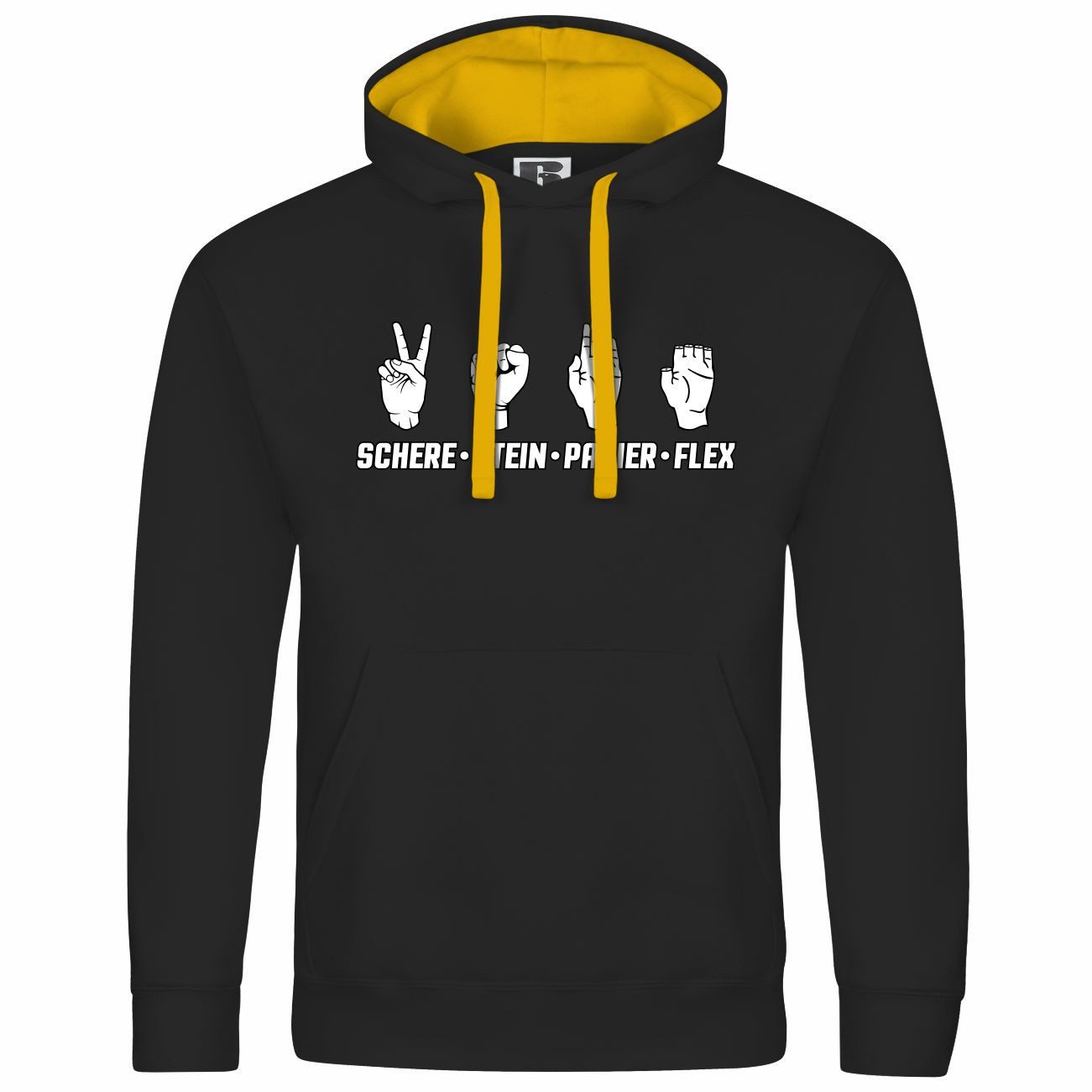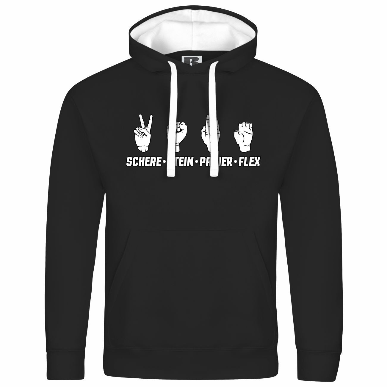 Das Motiv auf dem Kapuzenpullover zeigt die Handzeichen des Spiels „Schere, Stein, Papier“ und ergänzt es humorvoll um „Flex“. Ideal für Fans von lustigen Sprüchen und handwerklichen Berufen!