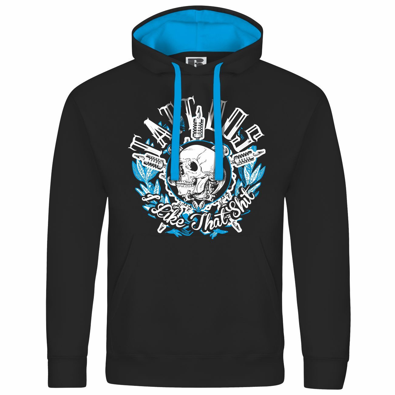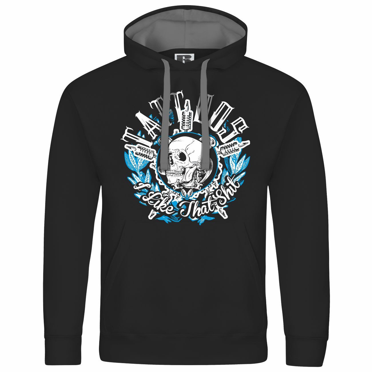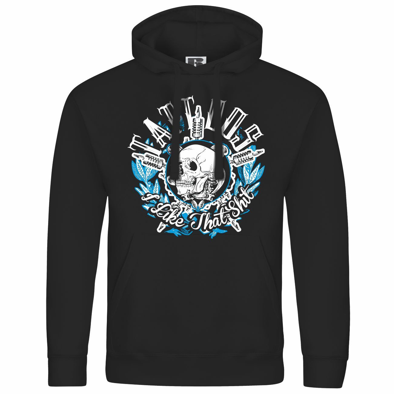 Das Motiv auf dem Kapuzenpullover zeigt einen Schädel, umgeben von Tattoomaschinen und der Aufschrift „I Like That Shit“. Mit blau-weißen Akzenten ist dieser Hoodie perfekt für Tattoo-Liebhaber.