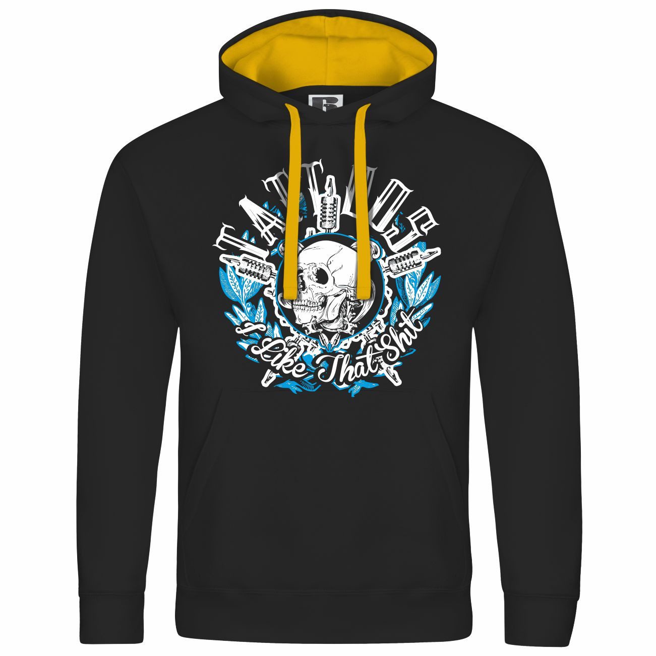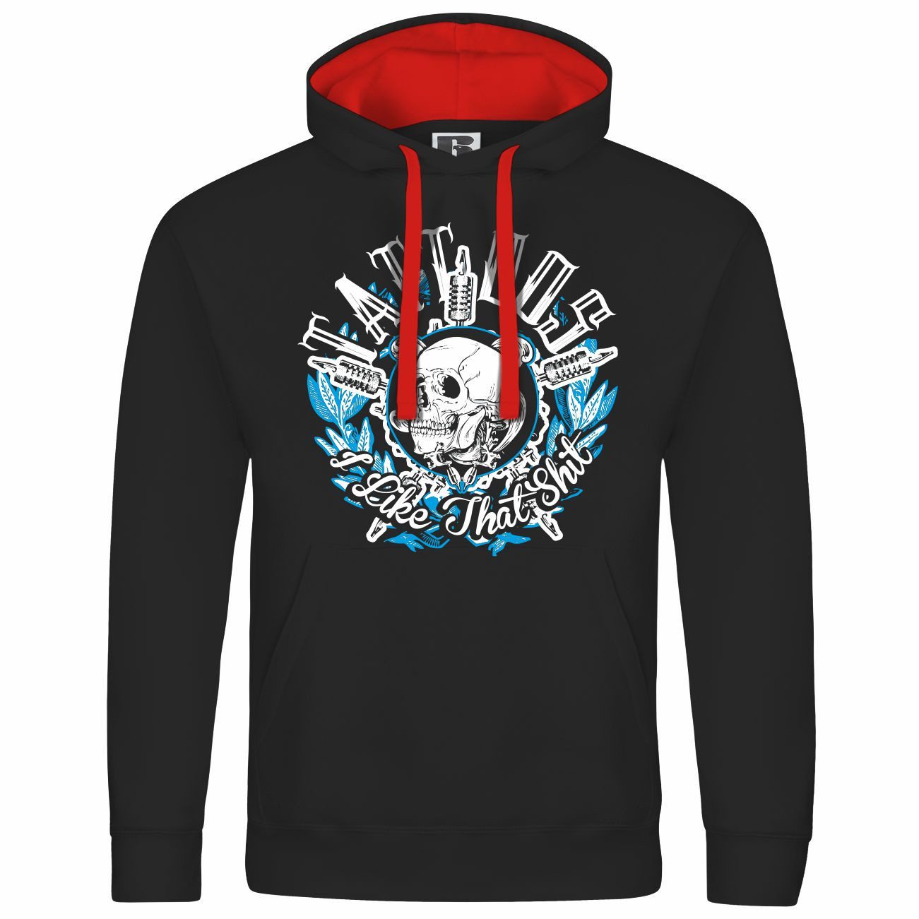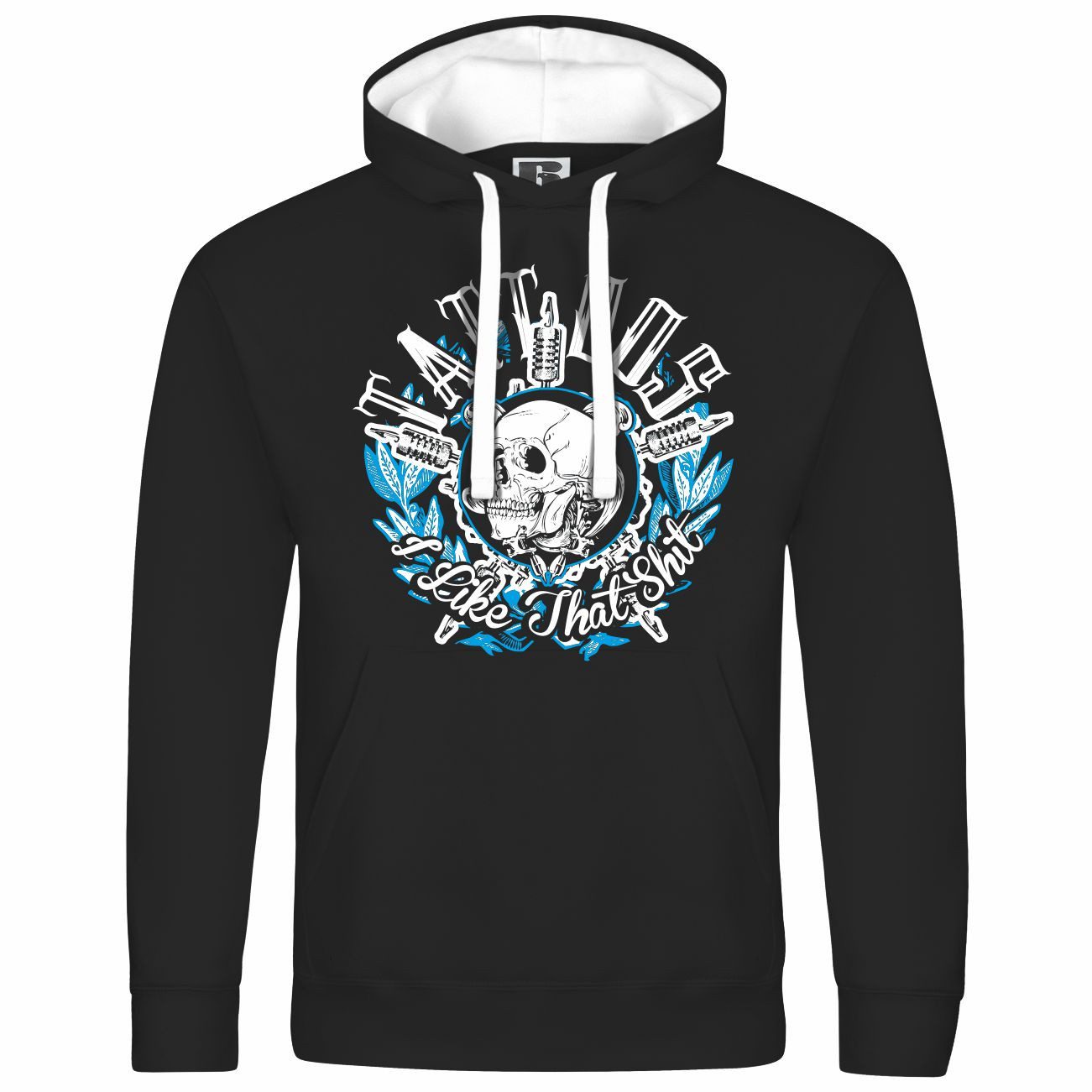 Das Motiv auf dem Kapuzenpullover zeigt einen Schädel, umgeben von Tattoomaschinen und der Aufschrift „I Like That Shit“. Mit blau-weißen Akzenten ist dieser Hoodie perfekt für Tattoo-Liebhaber.