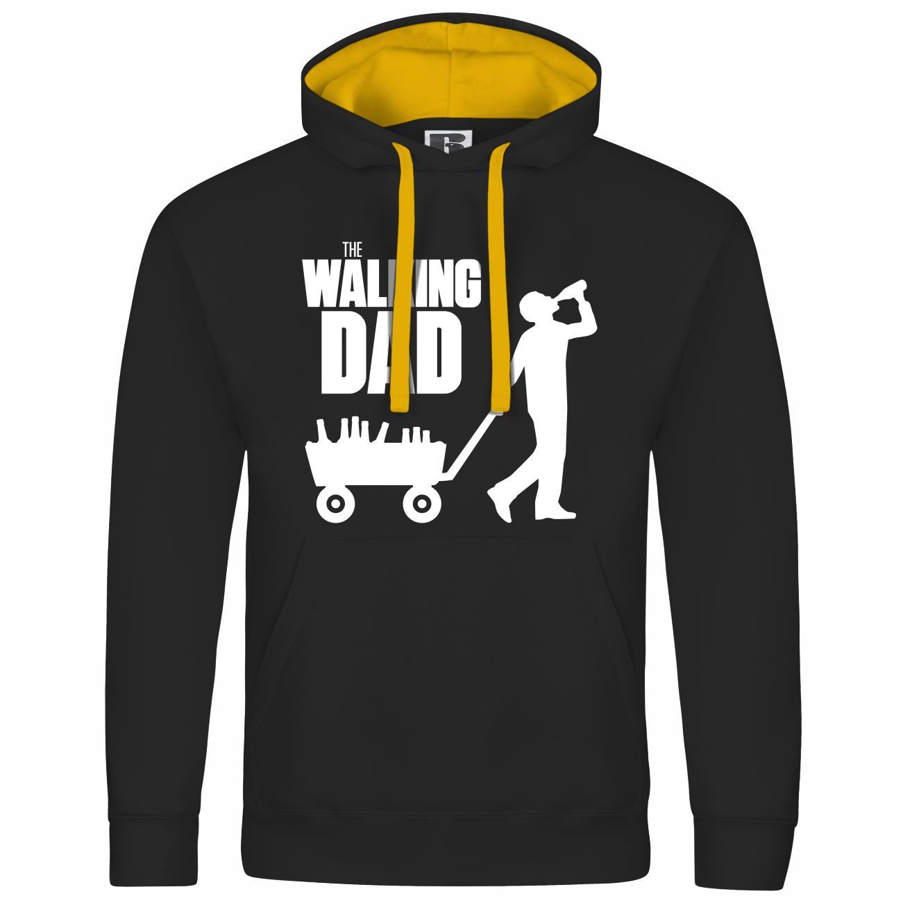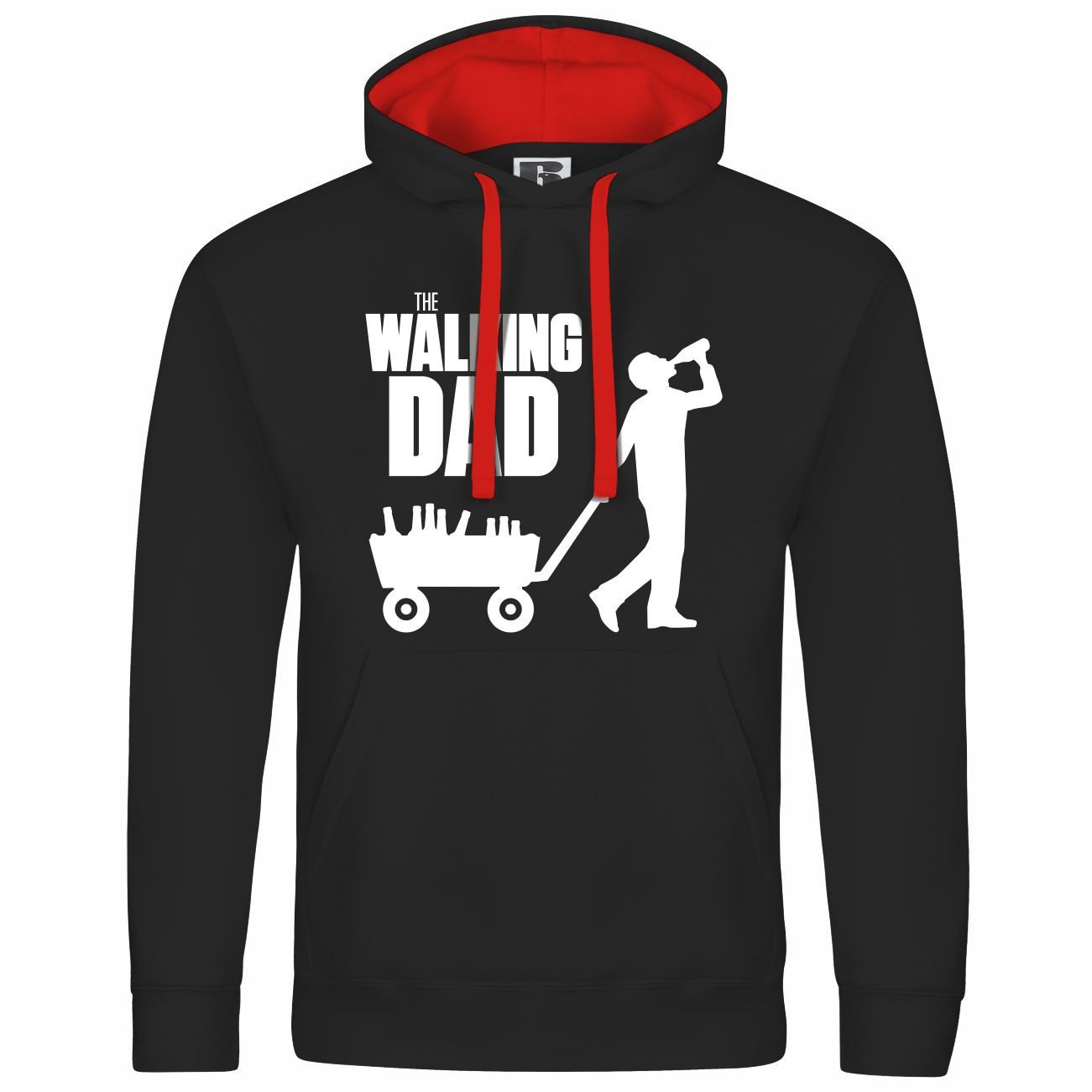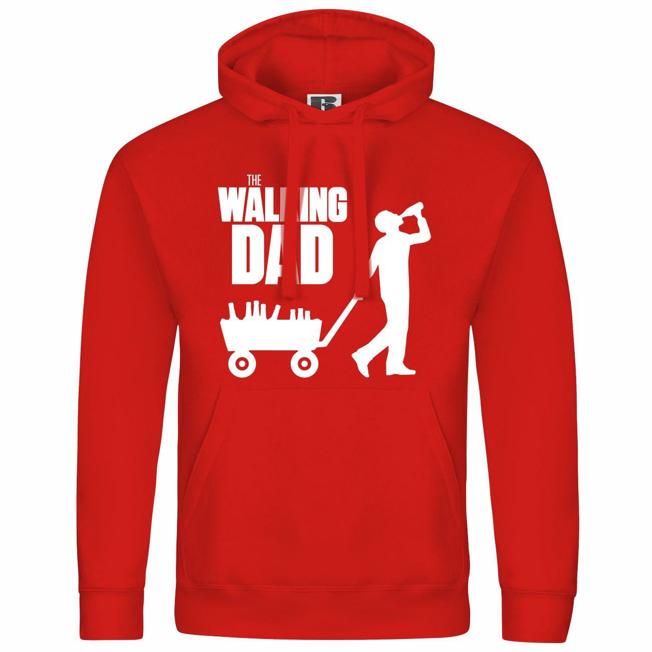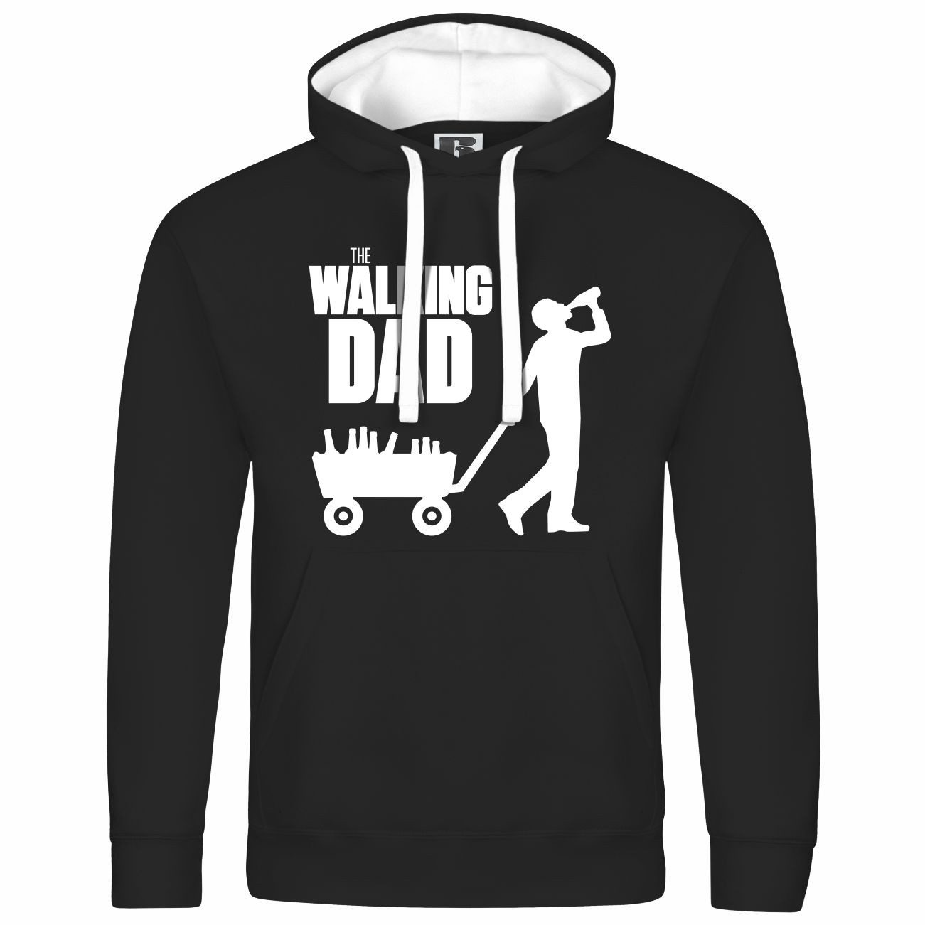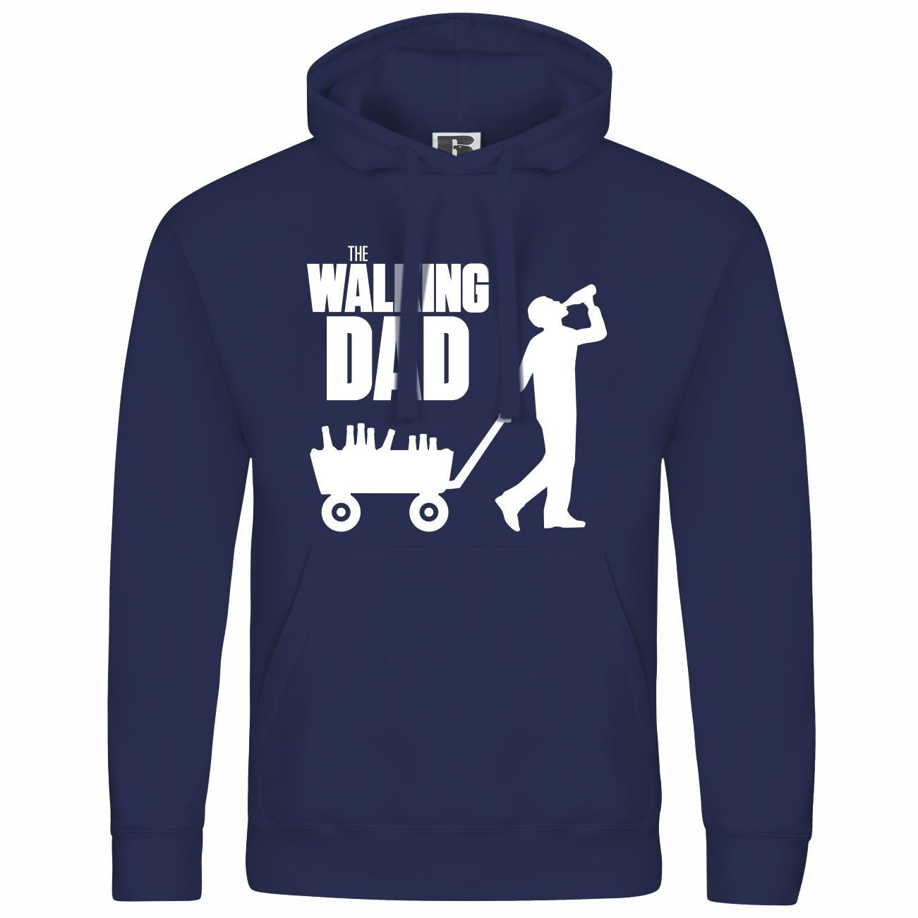 Das Motiv auf dem Kapuzenpullover zeigt einen Mann, der einen Bollerwagen mit Getränken zieht und dabei eine Flasche trinkt. Der humorvolle Schriftzug „The Walking Dad“ macht ihn perfekt für Väter!