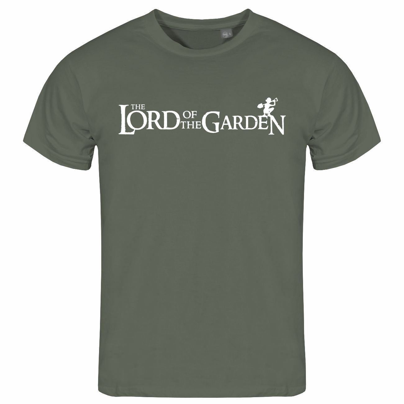 Das Motiv auf dem Shirt zeigt den Text "The Lord of the Garden" in einer stilvollen Schriftart, die an den Titel "The Lord of the Rings" erinnert. Rechts neben dem Text befindet sich eine kleine Figur, die eine Gartenschaufel über der Schulter trägt, was das Garten-Thema humorvoll unterstreicht. Das Design ist komplett in Weiß gehalten und hebt sich gut von der gewählten Farbe des T-Shirts ab.