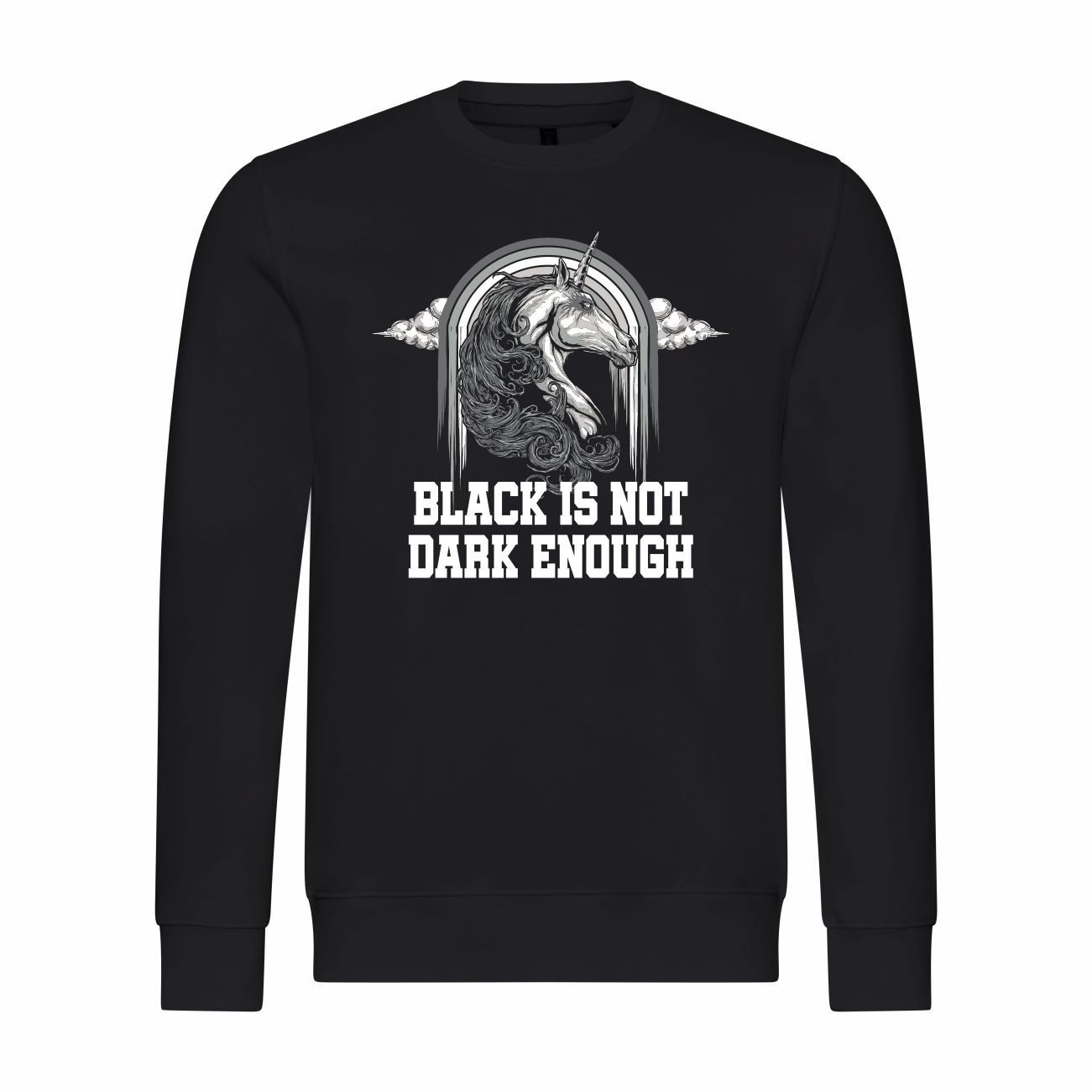 Das Sweatshirt zeigt ein stilvolles Einhorn in Schwarz-Weiß, umrahmt von düsteren Wolken und Regenbögen, mit dem provokanten Statement "Black Is Not Dark Enough". Perfekt für Individualisten!