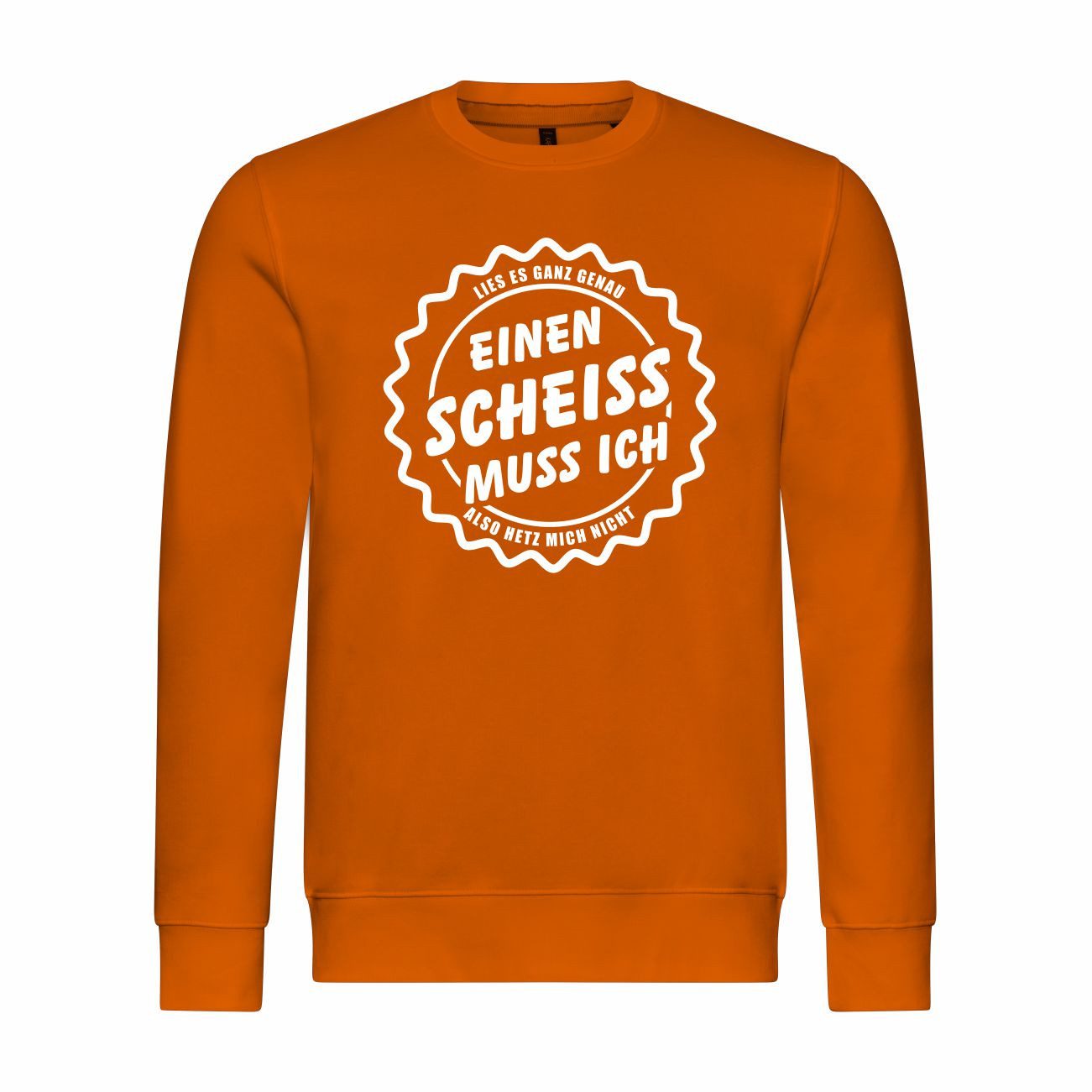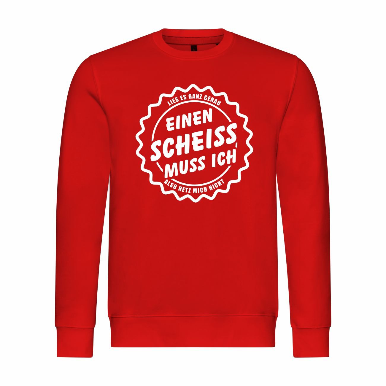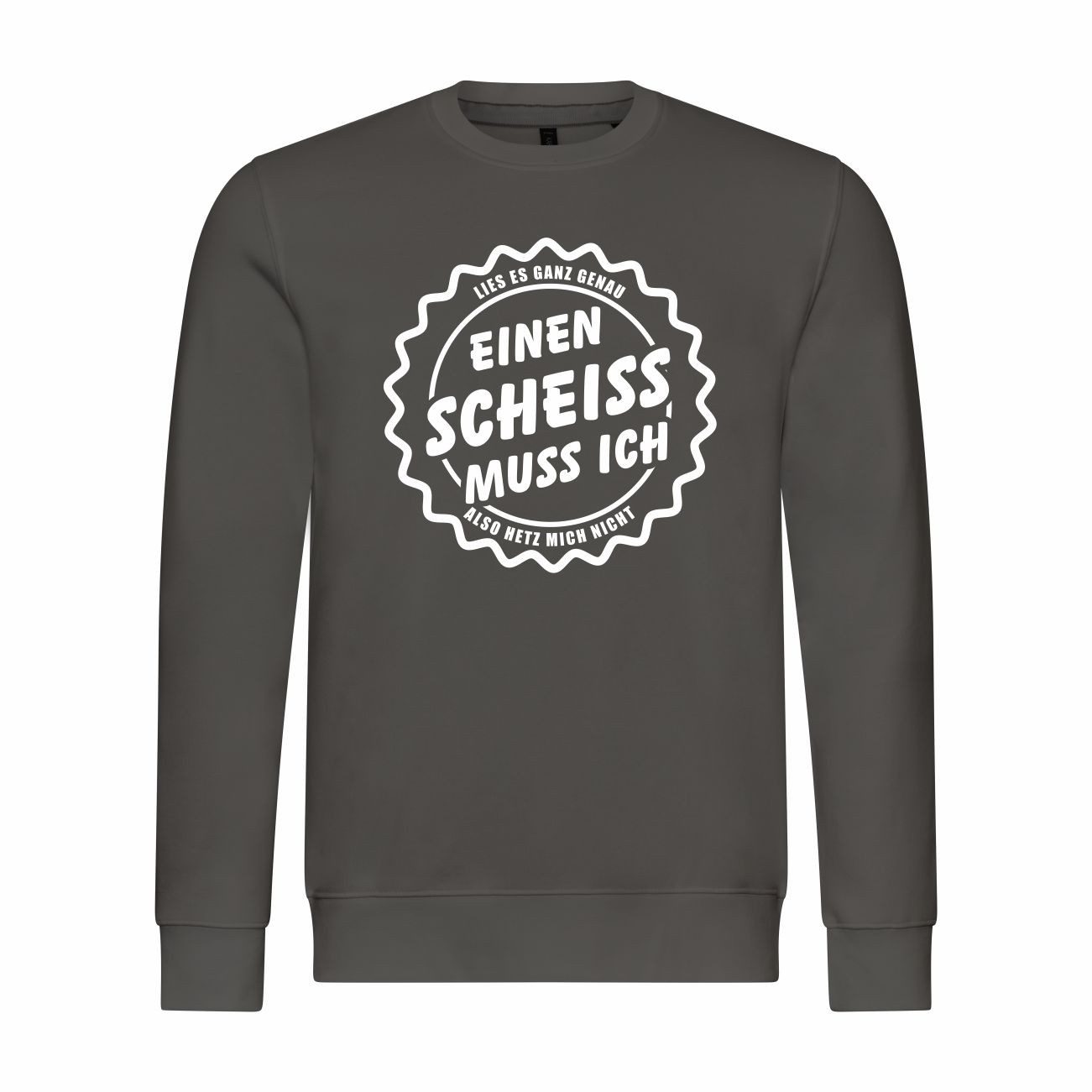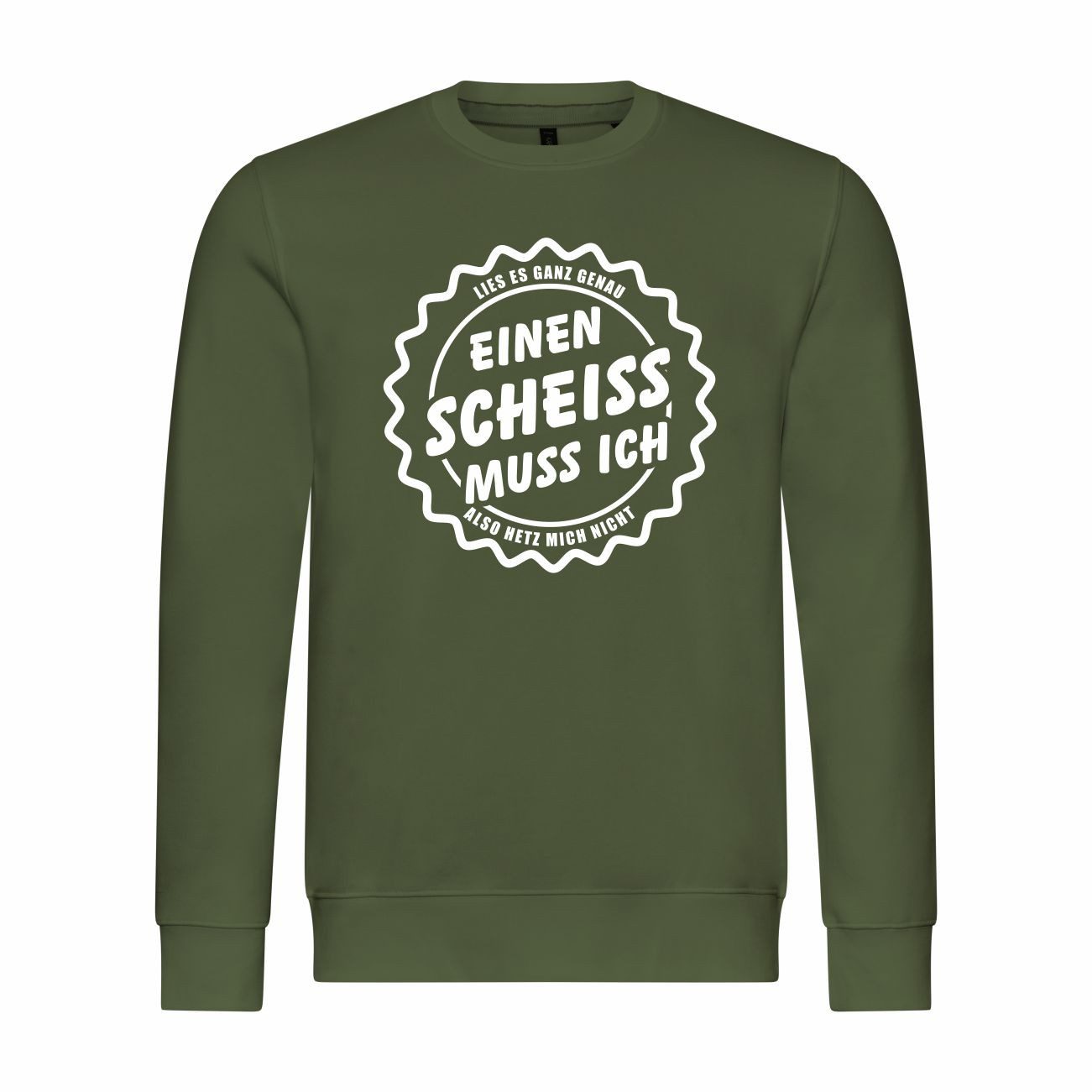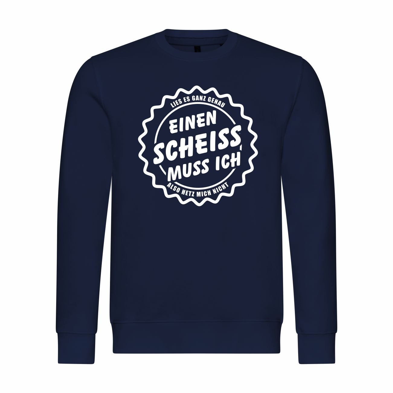 Das Sweatshirt zeigt in kräftigem Weiß den humorvollen Spruch "Einen Scheiß muss ich – also hetz mich nicht" im Siegel-Design. Perfekt für alle, die ein Statement setzen und dabei lässig bleiben wollen!