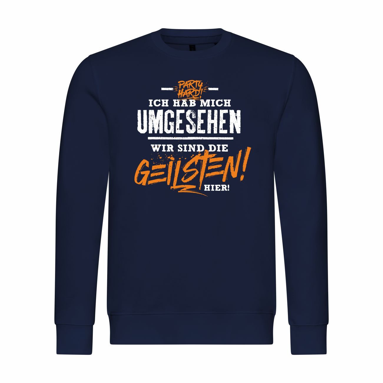 Das Motiv zeigt den humorvollen Spruch „Ich hab mich umgesehen, wir sind die Geilsten hier!“ in auffälliger Schrift. Perfekt für Partys und Events, setzt es ein klares Statement mit coolem, modernen Design.