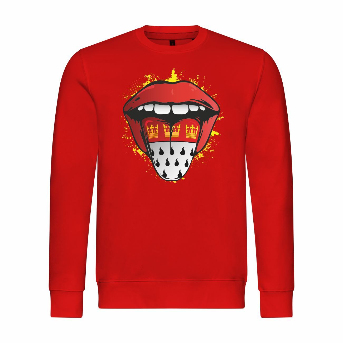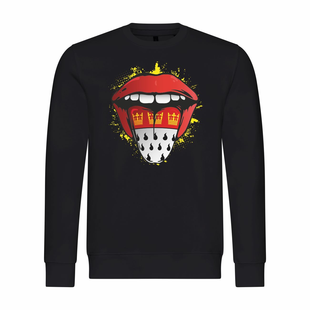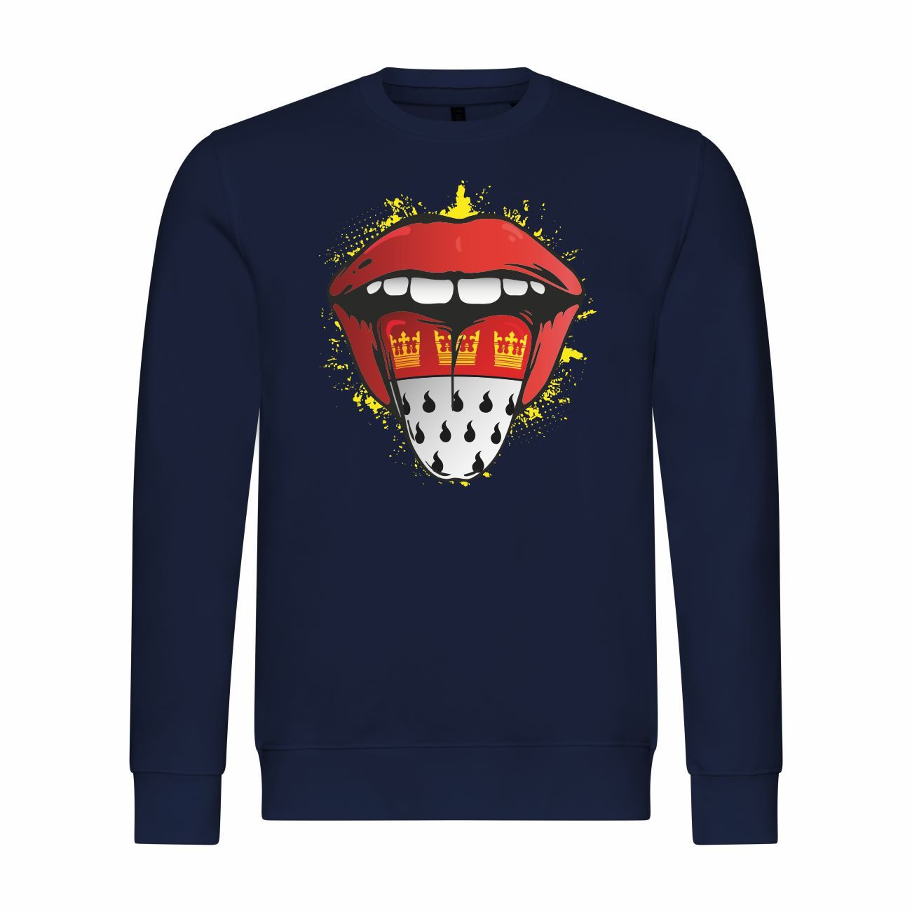 Das Sweatshirt zeigt ein auffälliges Motiv: ein geöffneter roter Mund, dessen Zunge das Kölner Stadtwappen darstellt. Umgeben von gelben Farbspritzern wird es zum perfekten Statement für Köln-Liebhaber!