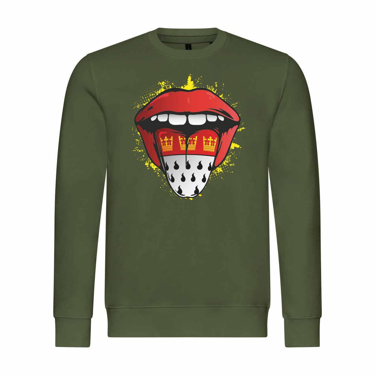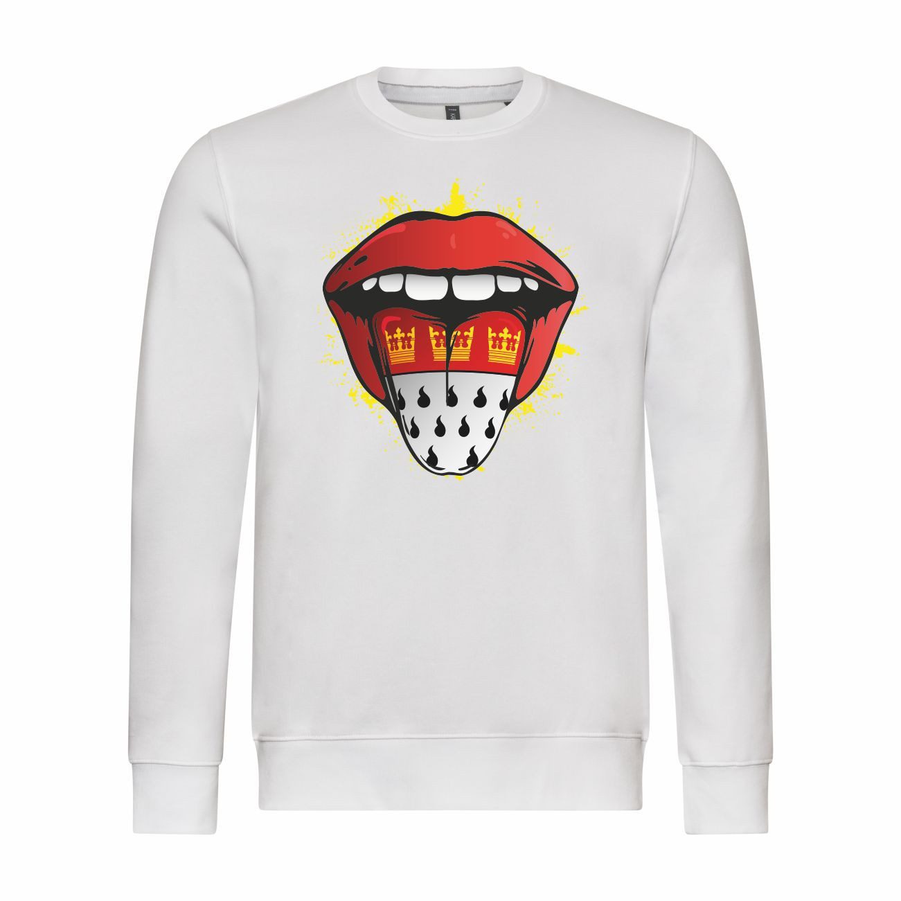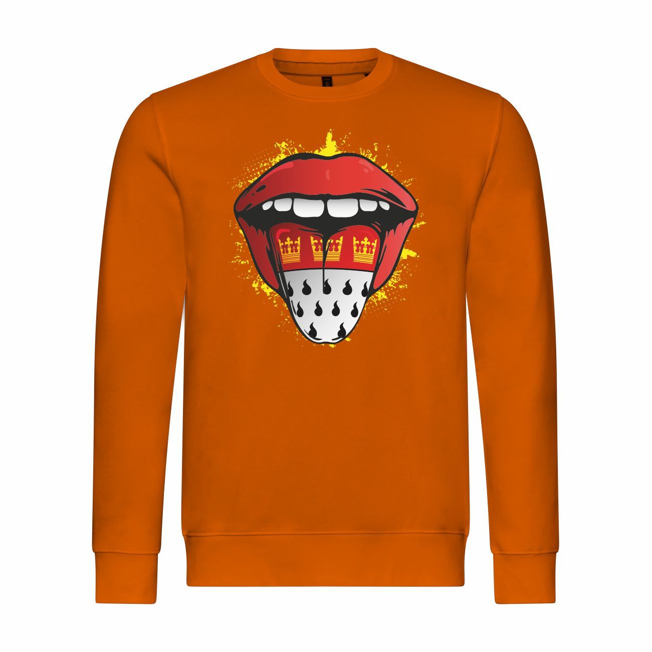 Das Sweatshirt zeigt ein auffälliges Motiv: ein geöffneter roter Mund, dessen Zunge das Kölner Stadtwappen darstellt. Umgeben von gelben Farbspritzern wird es zum perfekten Statement für Köln-Liebhaber!