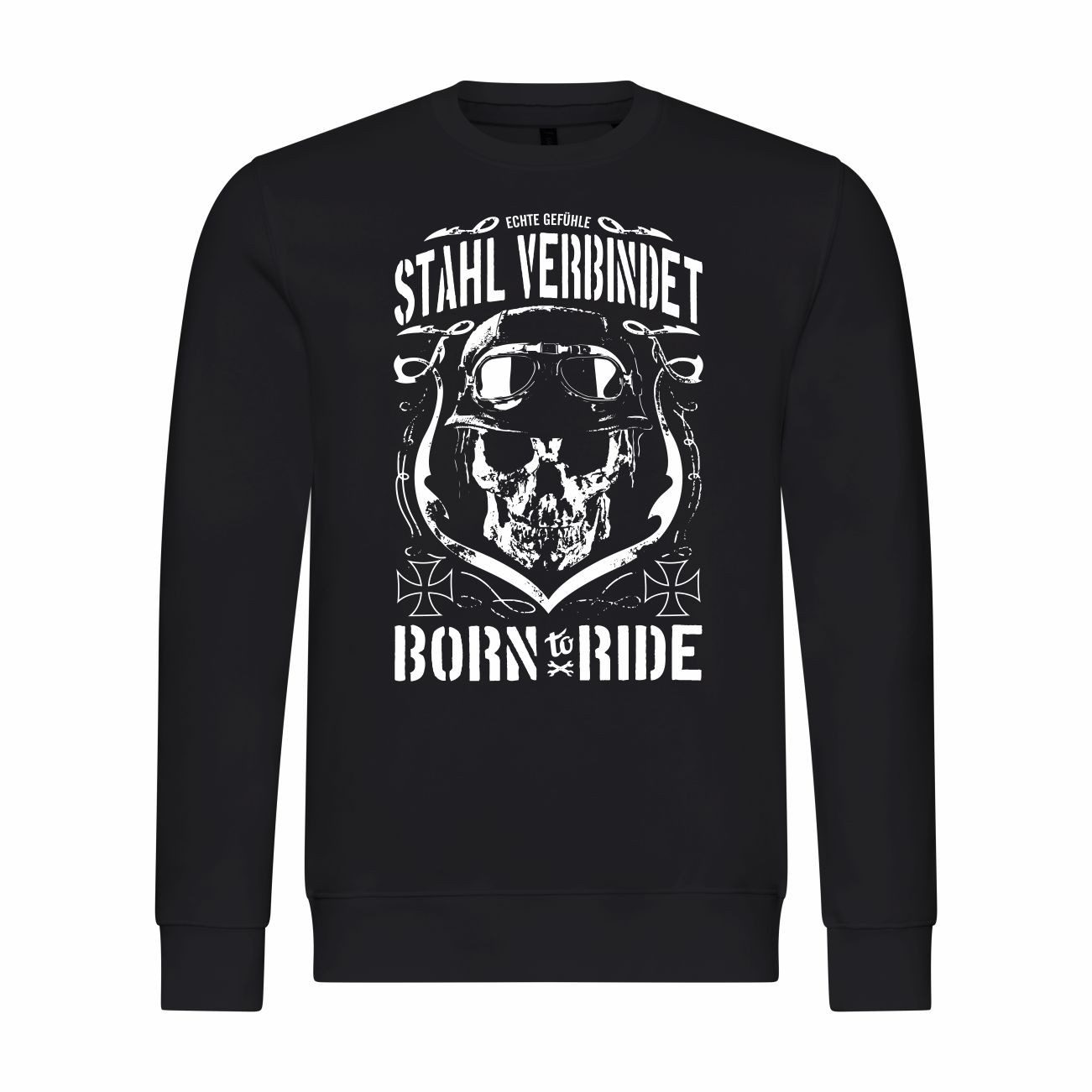 Das schwarze Sweatshirt zeigt ein beeindruckendes Motiv: Ein Totenkopf mit Helm und Brille, umrahmt von Haken und Kreuz-Emblemen. Der Schriftzug „Stahl verbindet – Born to Ride“ unterstreicht den Biker-Lifestyle.