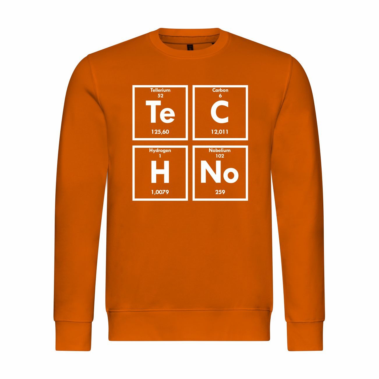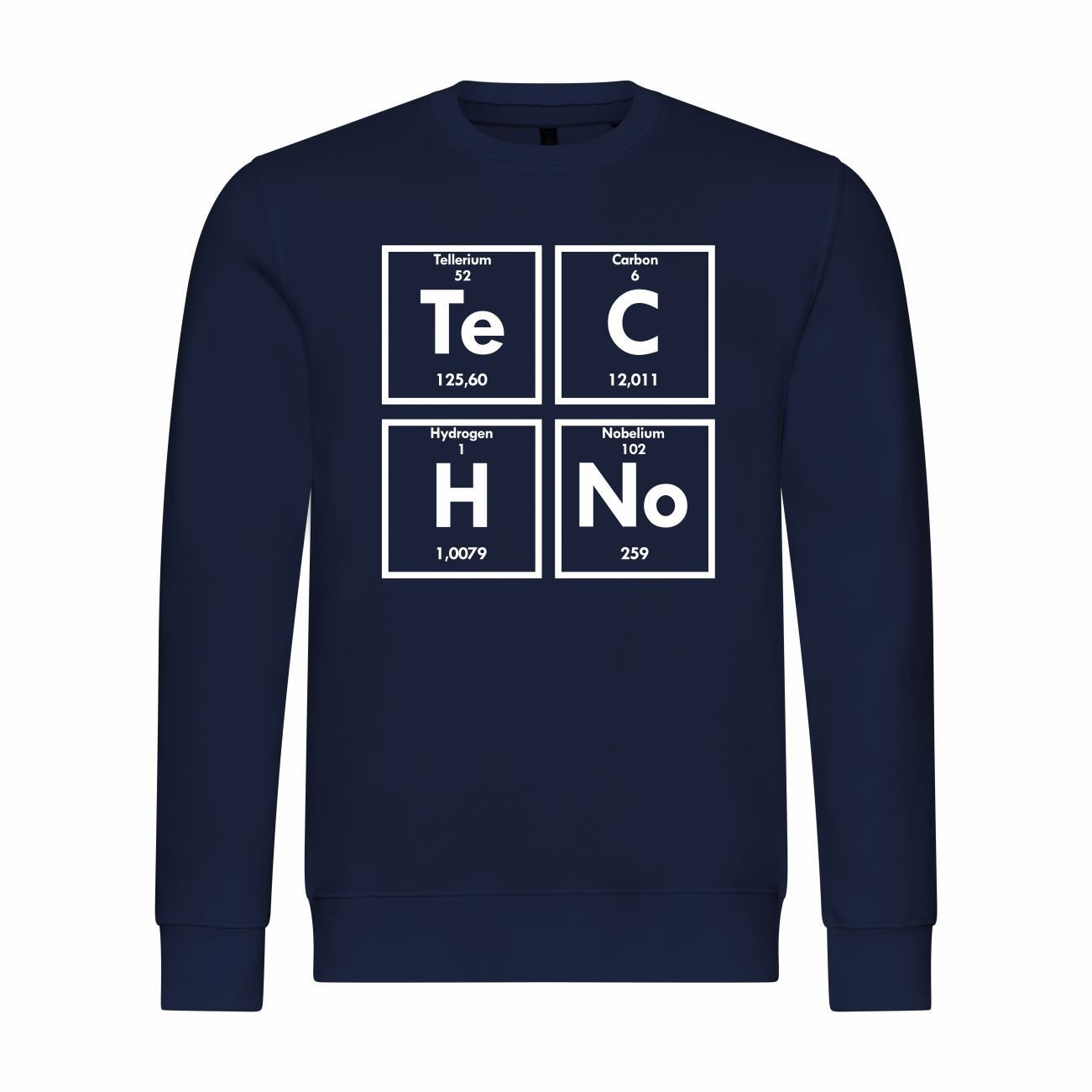 Das Sweatshirt kombiniert das Wort "Techno" mit Elementen des Periodensystems. Mit Tellurium, Kohlenstoff, Wasserstoff und Nobelium setzt es ein kreatives Statement für Techno-Fans und Wissenschafts-Liebhaber.