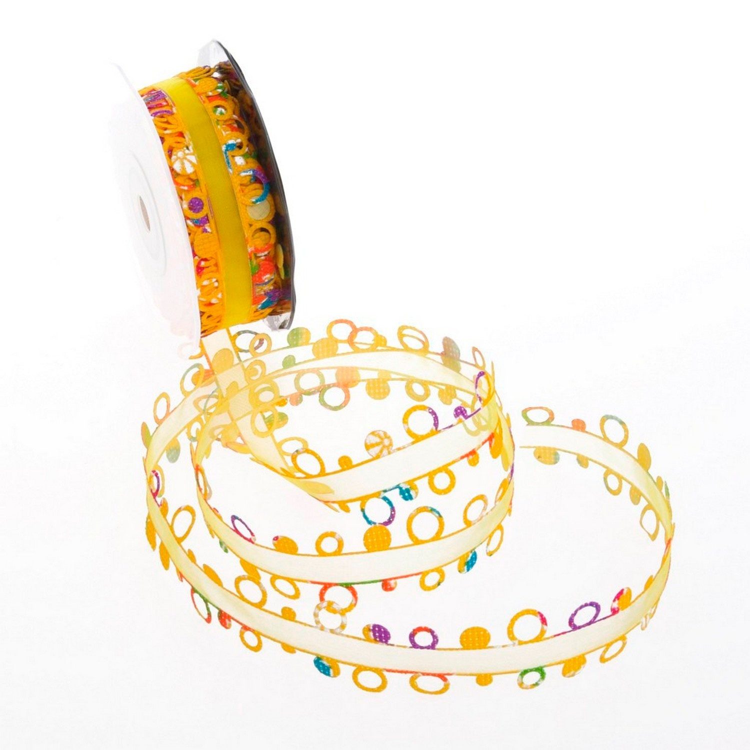 Eine wahre Farbexplosion sind die bunten ""Bubbles"" an gelbem Organzaband für fröhliche Dekorationen im Frühling und Sommer!Dekorieren Sie mit dem Band Ihren Tisch, zum Beispiel zu Ostern oder zur Gartenparty, oder verzieren Sie selbst gebastelte Gruß- und Einladungskarten - die knalligen Farben machen mit Sicherheit gute Laune und Lust auf Sommer.Durch die farbenfrohe und auffällige Farbgestaltung dekorieren Sie die ""Colorful Bubbles"" am besten auf einfarbigem Untergrund, sodass das Dekoband richtig zur Geltung kommt.