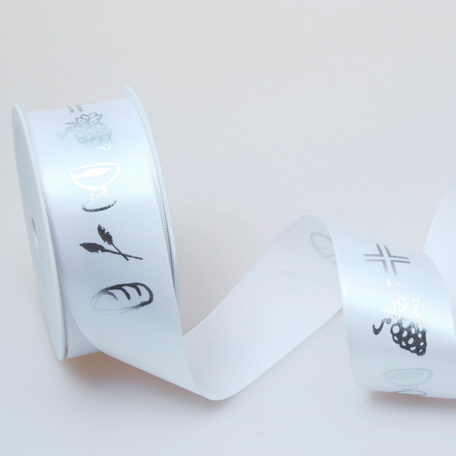 Все Symbole des Abendmahles - Trauben, Kelch, Ähren und Brot - und dazu das Kreuz als das christlichste aller Symbole sind auf diesem Satinband vereint. Das festliche Weiß und der stilvolle Aufdruck in Silber machen das Band perfekt für alle Dekorationen rund um das Fest der Erstkommunion, Konfirmation oder natürlich auch der Firmung, ob für die Tischdekoration, in Sträußen und Gestecken, für Geschenke und nicht zuletzt auch für die Taufkerze, die jedes Kommunionkind zu diesem schönen Anlass wieder entzünden und halten darf.Die glatte, seidige Qualität des Bandes erlaubt auch den Einsatz in der Gestaltung von Karten. Die Gestaltungsmöglichkeiten, z.B. mit Sizoweb, thematisch passender Streudeko und selbstklebender Bordüre, sind hierbei so vielfältig wie der Anlass. Natürlich denkt man bei Kartengestaltung als erstes an die Einladungskarten, die - schön gestaltet und rechtzeitig verschickt - dem Gast schon einen Vorgeschmack auf diese wichtige Feier im Leben Ihres Kindes geben. Passend zur Tafeldeko dürfen natürlich auch Tischkarten nicht fehlen. Aber vergessen Sie auch nicht, über Ihre eigene Feier hinauszudenken und machen Sie einem befreundeten Kommunionkind eine Freude mit einer individuell gestalteten Glückwunschkarte! Auch Geldgeschenke zur Konfirmation wirken viel persönlicher, wenn man an Stelle der fertig gekauften Grußkarte selbst seine Phantasie und Kreativität spielen lässt. Dieses Satinband ist außer in Weiß auch in der Farbe Creme erhältlich, mit dem Aufdruck wahlweise in Gold oder Silber. Neben der Breite von 40 mm ist auch eine Ausführung in 25 mm vorrätig. Auf einer Rolle befinden sich 25 Meter Band, Sie können aber auch Bandabschnitte in individuell wählbaren Длинаn bestellen.