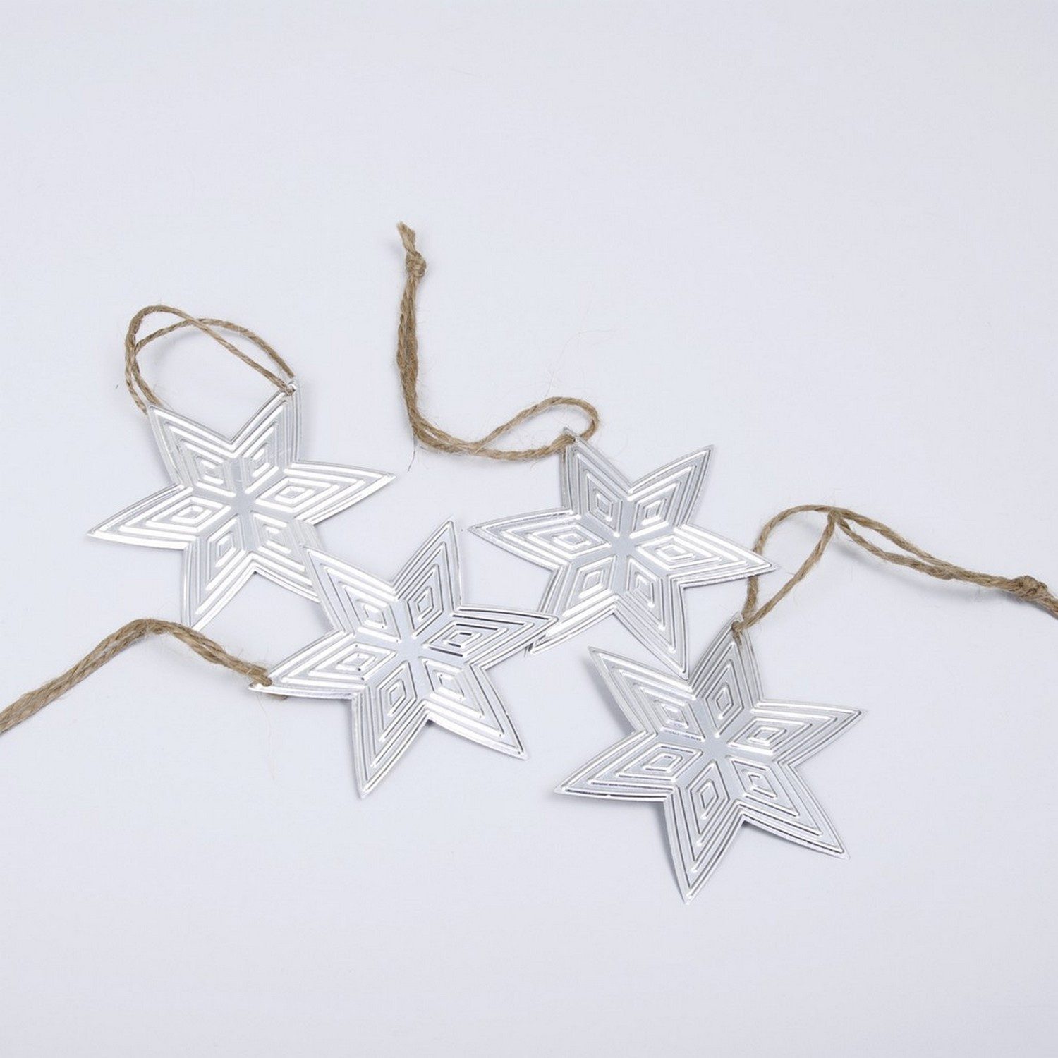 Weihnachtlich glänzende Sterne aus flachem Metall mit naturfarbener Schnur zum Aufhängen. Schmücken Sie Ihren Tannenbaum oder den Adventskranz mit den leichten Sternen, hängen Sie sie vor ein Fenster oder nutzen Sie einen Stern als hübschen Geschenkanhänger - die silbernen Accessoires sind besonders vielseitig. Die dezenten Farben lassen verschiedenste Kombinationsmöglichkeiten zu, in der glatten Oberfläche der Sterne werden Farben und Lichter wunderschön reflektiert.