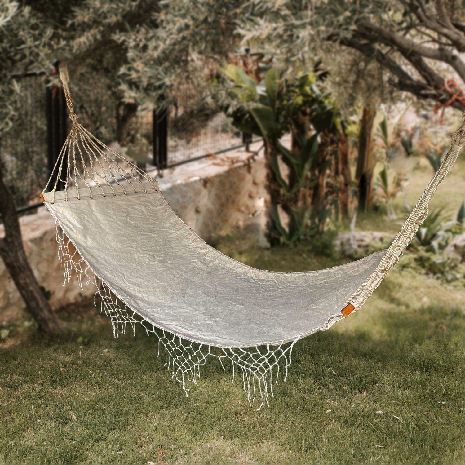 Hängematte mit Fransen – Boho-Chic für entspannte Momente Verleihen Sie Ihrem Zuhause oder Garten einen Hauch von Bohème-Charme mit unserer stilvollen Hängematte mit Fransen. Diese Hängematte ist nicht nur ein Ort der Entspannung, sondern auch ein dekoratives Highlight, das Ihrem Raum eine warme und einladende Atmosphäre verleiht. Design trifft auf Komfort Die Hängematte besticht durch ihr einzigartiges Boho-Design mit handgefertigten Fransen, die für eine romantische und verspielte Optik sorgen. Das weiche Material bietet optimalen Komfort und lädt zum Relaxen ein – ob im Wohnzimmer, auf dem Balkon oder unter freiem Himmel. Hochwertige Materialien für drinnen und draußen Material: Aus robuster Baumwolle gefertigt, ist die Hängematte nicht nur langlebig, sondern auch angenehm auf der Haut. Fransen-Details: Die dekorativen Fransen sind kunstvoll verarbeitet und verleihen der Hängematte einen Hauch von Eleganz. Wetterfest: Ideal für den Einsatz im Garten oder auf der Terrasse, da das Material atmungsaktiv und pflegeleicht ist. Einfache Montage und vielseitige Nutzung Die Hängematte lässt sich schnell und unkompliziert an Hängemattenständern, Bäumen oder geeigneten Befestigungspunkten montieren. Ob als Relax-Lounge im Garten, Deko-Element im Wohnzimmer oder gemütlicher Rückzugsort – diese Hängematte passt in jede Umgebung. Ihre Vorteile auf einen Blick: Einzigartiges Design: Handgefertigte Fransen für einen stilvollen Boho-Look. Vielseitig einsetzbar: Perfekt für Indoor- und Outdoor-Nutzung. Hochwertige Qualität: Aus langlebigen und umweltfreundlichen Materialien gefertigt. Leicht zu pflegen: Waschbare Materialien für einfache Reinigung. Perfekt für jeden Anlass Die Hängematte mit Fransen eignet sich nicht nur für entspannte Sommertage, sondern auch als dekoratives Highlight für Gartenpartys, Hochzeiten oder Fotoshootings. Zudem ist sie eine originelle Geschenkidee für Freunde und Familie. Jetzt Ihre Boho-Hängematte entdecken! Schaffen Sie Ihren persönlichen Wohlfühlort mit unserer Hängematte mit Fransen. Gönnen Sie sich den Luxus von Komfort und Design – perfekt, um dem Alltag zu entfliehen und entspannte Momente zu genießen.