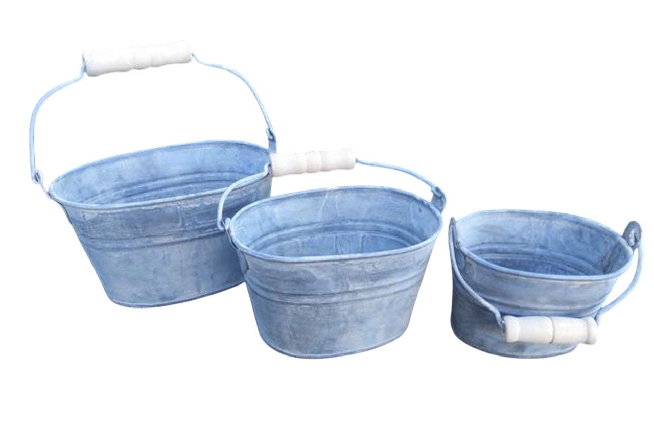 Zinkschalen / Pflanztopfset / Eimerset / 3 Stück 3 Stück kleine, dekorative Pflanzschalen, Pflanztöpfe, Pflanzeimer. Tischdekoration. Aus verzinktem Eisenblech. Wasserdicht verarbeitet. Mit wunderschöner, grauer Antikpatina. Jede Schale hat einen praktischen, klappbaren Henkel mit Holzgriff. Größen ca: 16 x 11 cm, 9 cm hoch. 13 x 9 cm, 8 cm hoch. 10 x 7,5 cm, 7 cm hoch