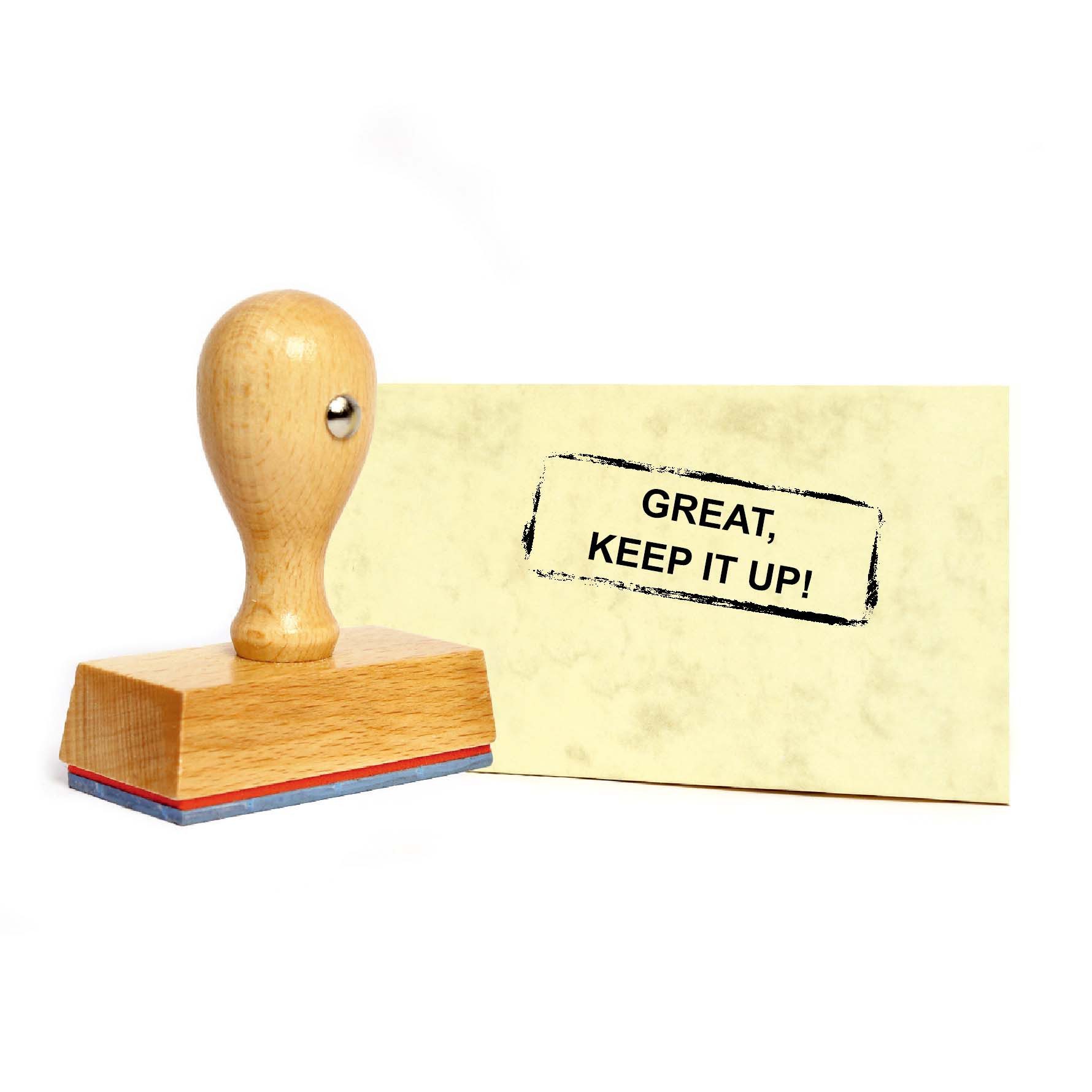 Sie erwerben einen Holzstempel mit abgebildetem Abdruck GREAT KEEP IT UP mit einem Vintage Rahmen.