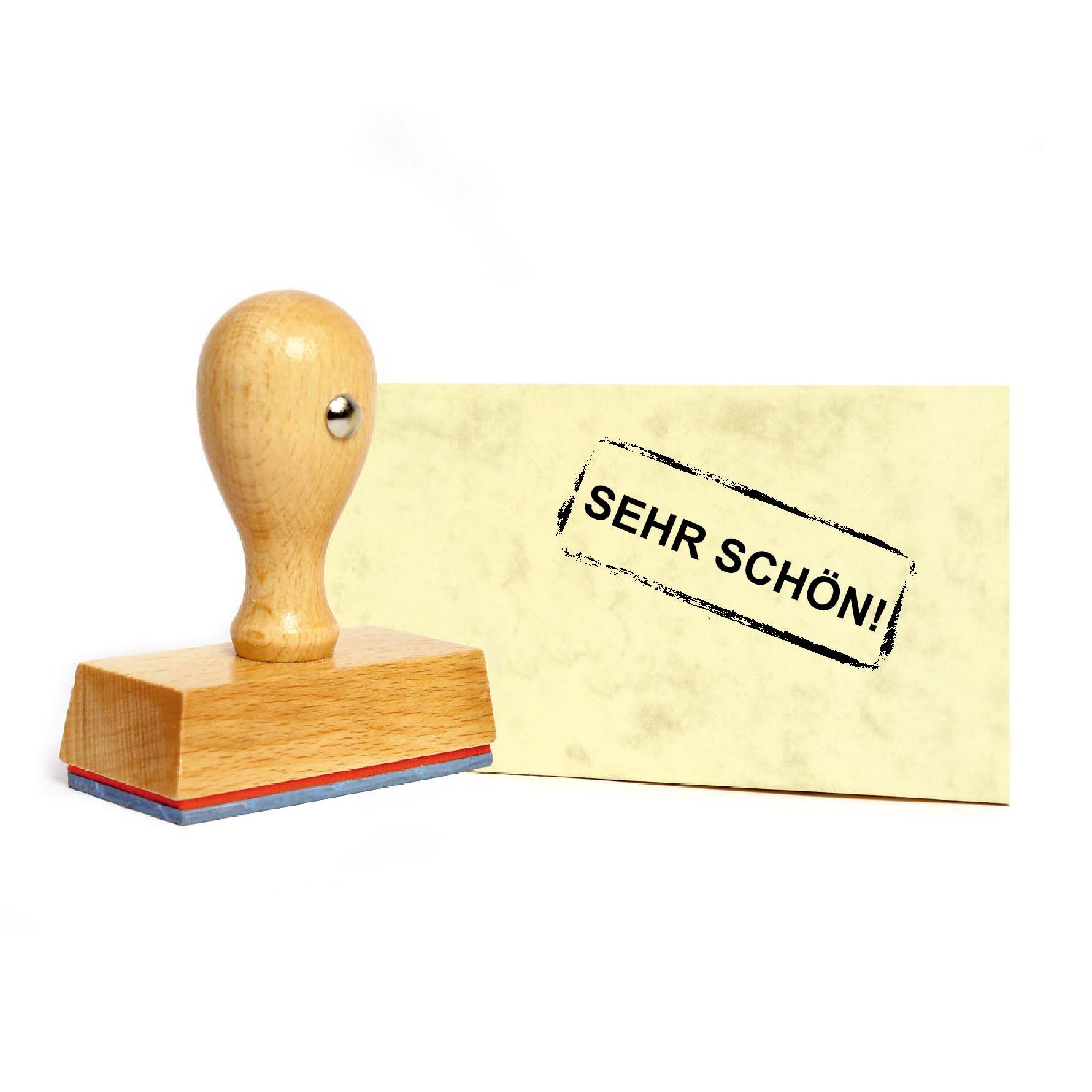 Sie erwerben einen Holzstempel mit abgebildetem Textabdruck SEHR SCHÖN mit einem Vintage Rahmen.