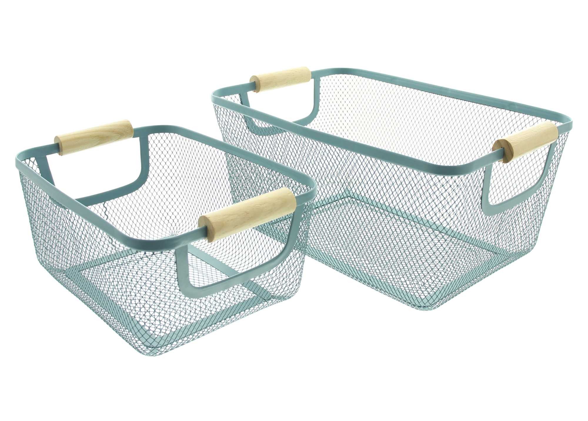 Die beiden Körbe bestehen aus feinmaschigem Drahtgeflecht, das in einem matten Blau lackiert ist und so einen modernen, luftigen Look erzeugt. Dieses dezente Farbspiel fügt sich harmonisch in verschiedenste Wohnstile ein – ob skandinavisch, modern oder rustikal. Das offene Geflecht ermöglicht jederzeit einen schnellen Blick auf den Inhalt und sorgt gleichzeitig für eine gute Luftzirkulation – ideal zum Beispiel für Obst & Gemüse, Küchenutensilien oder Artikel im Badezimmer.