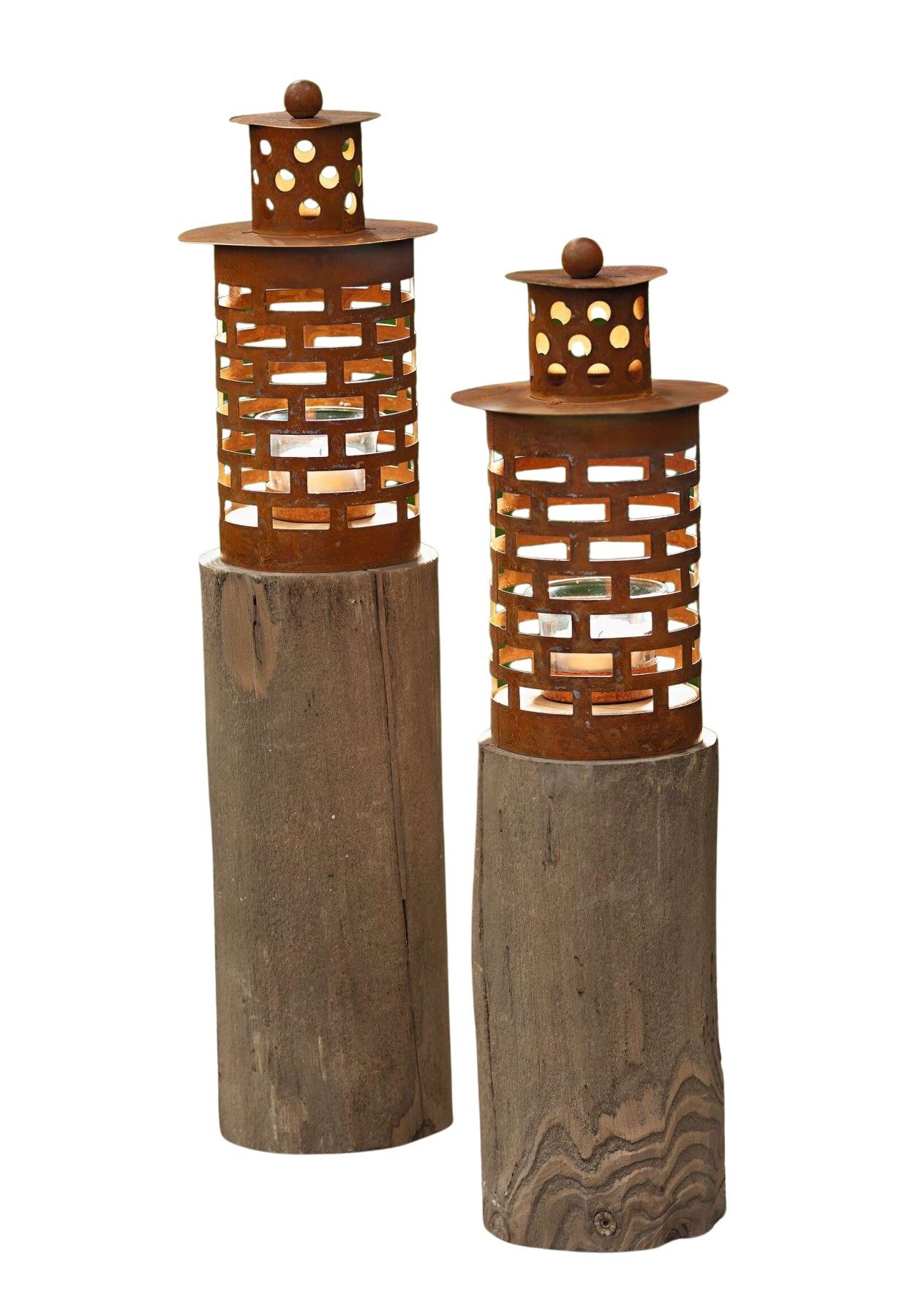 Die Windlichter bestehen aus robusten Holzsäulen, die als stabile Basis dienen. Die darauf thronenden Metalltürmchen in ansprechender Rostoptik verleihen den Dekosäulen einen rustikalen Charme, der sich ideal für verschiedene Wohnstile eignet – ob modern, ländlich oder boho.