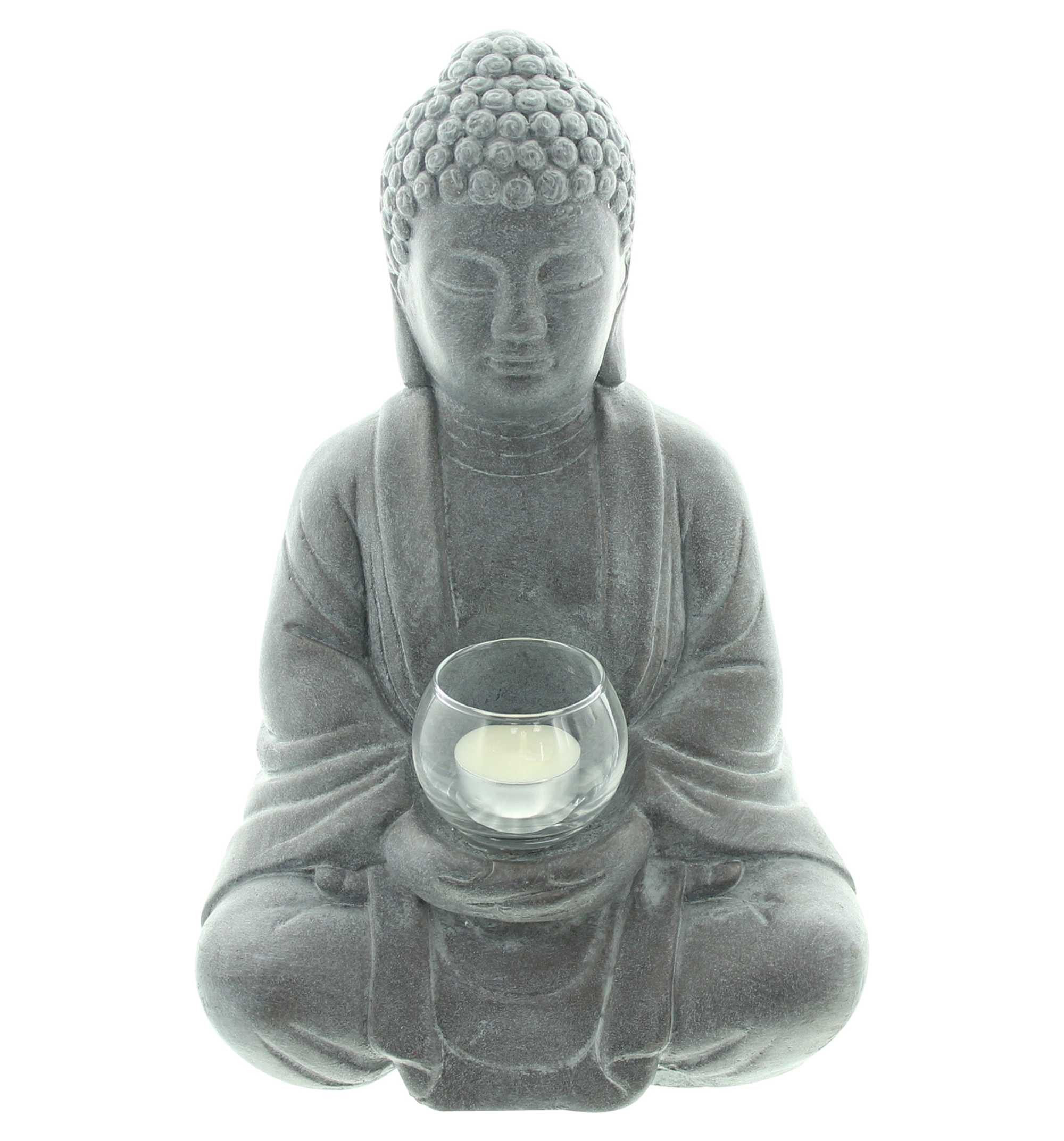 Die Gartendekofigur zeigt den Buddha in meditierender Haltung, mit einem Glas-Teelichthalter in den Händen – ein wunderschöner symbolischer Akzent, der für inneres Licht, Erleuchtung und spirituelle Klarheit steht. Sobald Sie eine Kerze darin entzünden, entsteht eine sanfte, warme Atmosphäre, die Entspannung und Geborgenheit vermittelt.