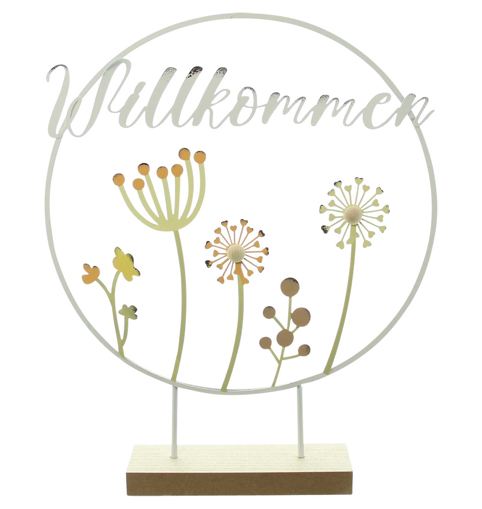Gefertigt aus hochwertigem Metall präsentiert sich der runde Ring in klassischem Weiß, ergänzt durch den dekorativen Schriftzug „Willkommen“ im modernen Handschrift-Look. Die zarten Blumenmotive in harmonisch abgestimmten Pastelltönen sind bunt lackiert und verleihen dem Metallkranz seinen verspielten, fröhlichen Charakter. Der angesagte Shabby-Look sorgt für einen Hauch von Vintage-Charme und macht das Stück besonders vielseitig einsetzbar – egal ob Landhaus, Boho oder moderner Wohnstil.