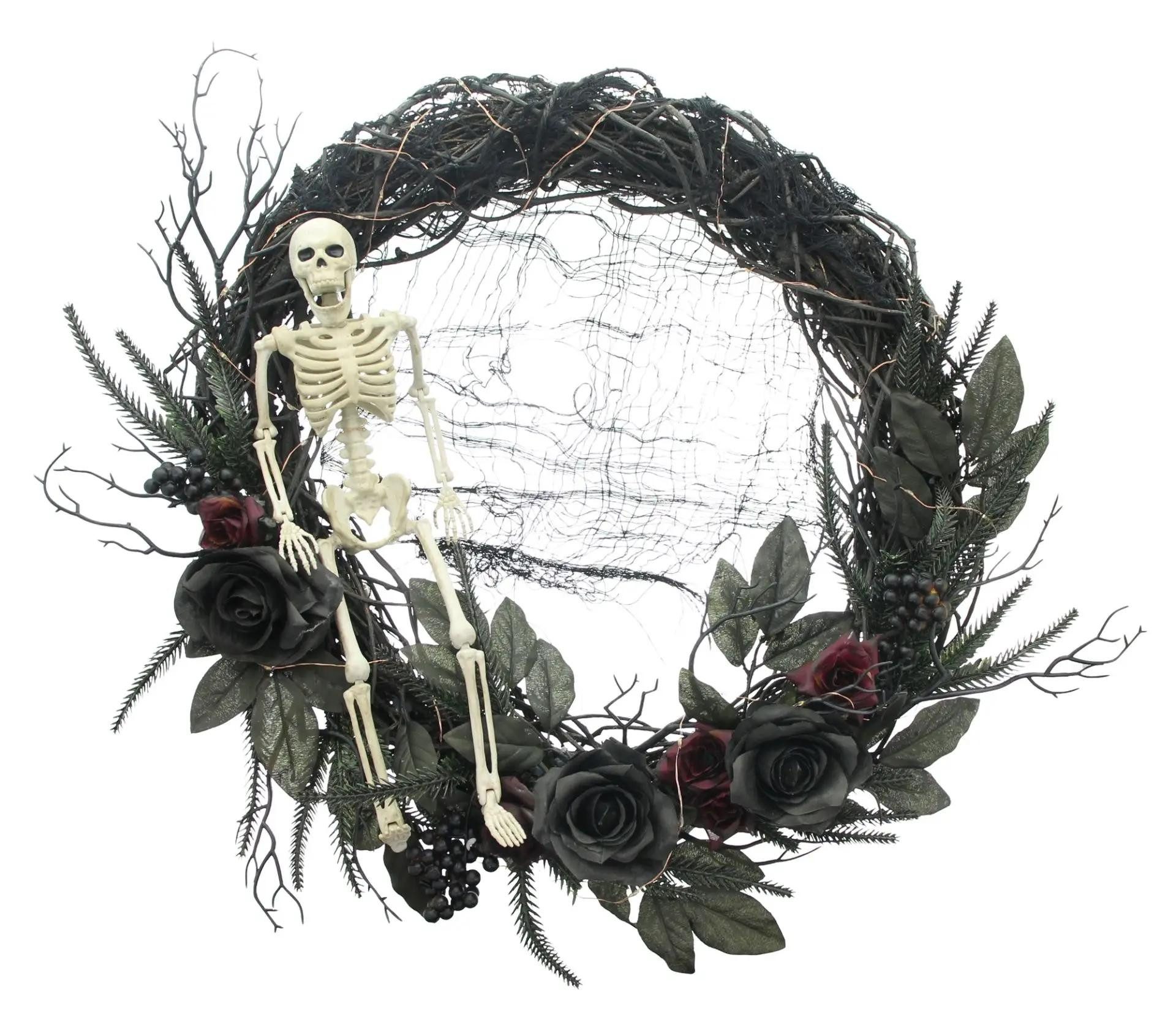 Der Kranz ist aus schwarz gefärbten Kiefernzweigen gefertigt und mit viel Liebe zum Detail dekoriert: Schwarze und dunkelrote Kunstblumen, kleine Beeren und ein filigranes Polyesternetz verleihen ihm eine geheimnisvolle Ausstrahlung. Highlight der Gestaltung ist das detailreiche Kunststoff-Skelett, das dem Tannenkranz eine schaurige, aber zugleich dekorative Note verleiht.