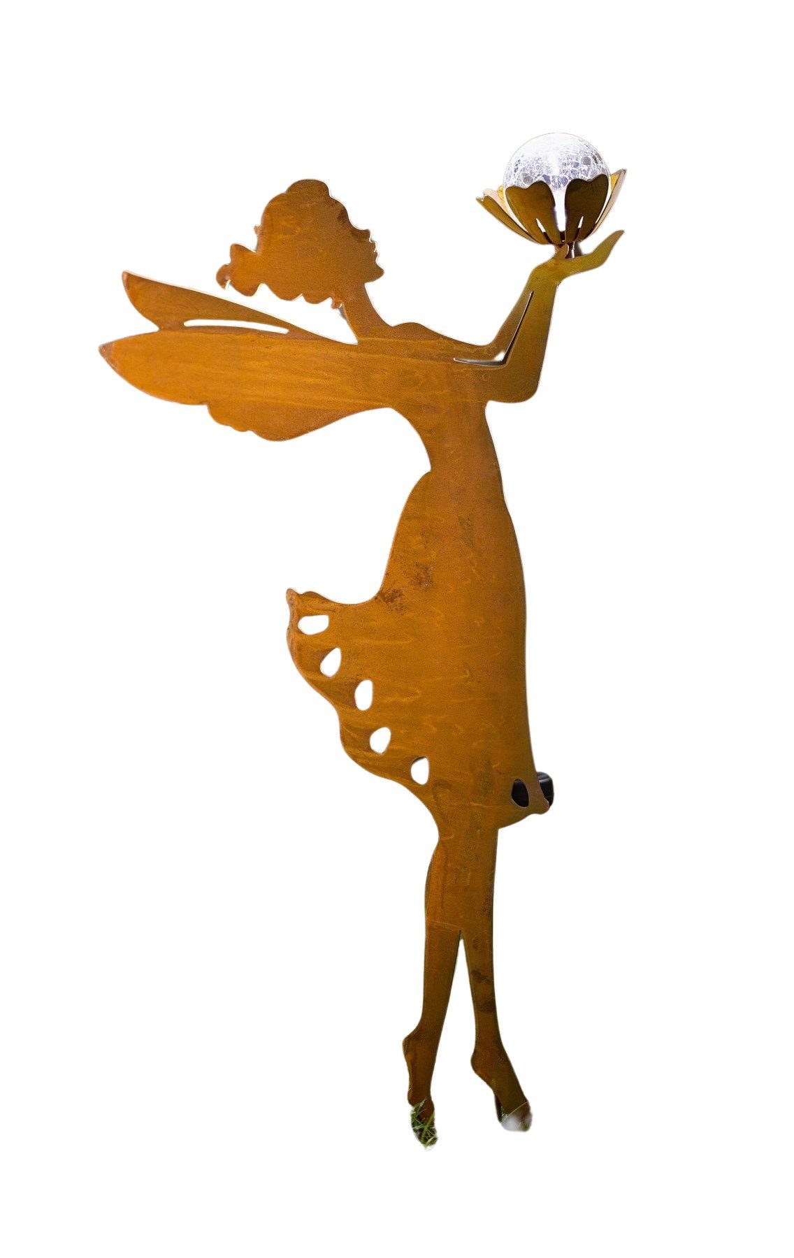 Die Gartenfigur ist aus Metall gefertigt und mit einem stilvollen Rostdesign versehen, das perfekt zum aktuellen Landhaus- und Vintage-Trend passt. Besonders liebevoll gestaltet zeigt sich die anmutige Fee, die eine leuchtende Glaskugel wie eine wertvolle Blume in ihren Händen trägt.