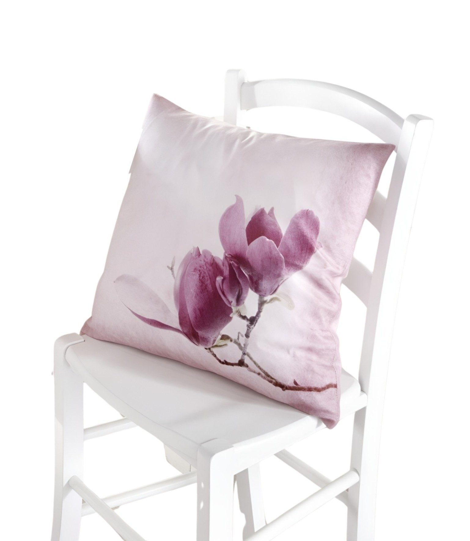 Die Vorderseite der Dekokissenhülle ziert ein ansprechendes Blumenmotiv in sanften Rosatönen, inspiriert von der Tulpenmagnolie. Dieses Design verleiht der Hülle eine zarte und einladende Optik, ideal für die Frühlings- und Sommermonate. Die Rückseite ist in einem einheitlichen Farbton gehalten, was zusätzliche Styling-Optionen bietet und die Hülle vielseitig einsetzbar macht.