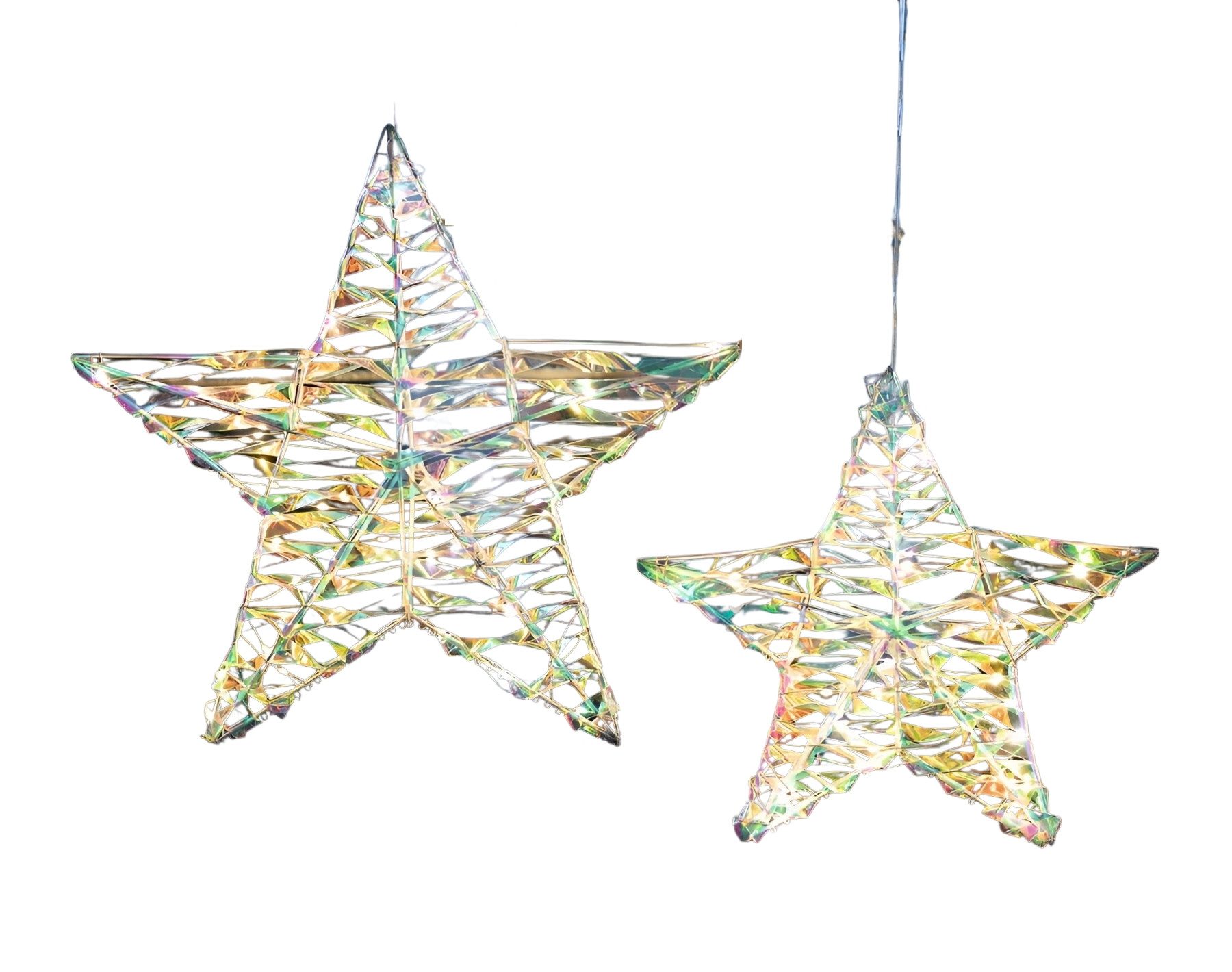 Bringen Sie mit dem LED Dekohänger „Rainbow“ im 2er Set eine stimmungsvolle Atmosphäre in Ihr Zuhause oder Ihren Garten. Die beiden leuchtenden Sterne überzeugen durch ihr modernes Design und besondere Lichteffekte. Statt Glitter oder Spiegelbeschichtung sorgen irisierende Kunststoffbänder für einen schimmernden Look, der je nach Blickwinkel und Lichteinfall in unterschiedlichen Farben glänzt. Auf einem stabilen Metallrahmen geschnürt, behalten die Dekoanhänger stets ihre elegante Form und fügen sich harmonisch in jede Dekoration ein.