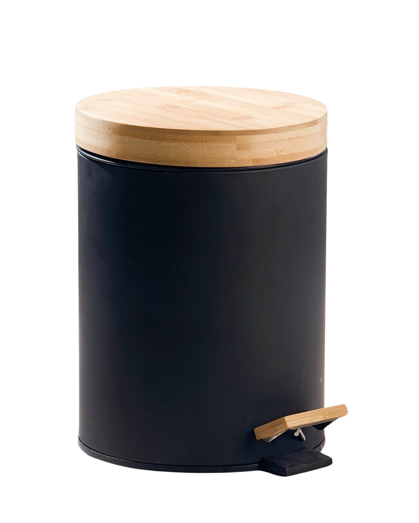 Der Treteimer ist aus mattschwarzem Kunststoff in edler Optik. Der Deckel ist aus Bambusholz und verfügt zudem über eine Absenkautomatik, um störende Geräusche zu vermeiden. So vereint der kleine Abfallsammler modernes Design und Funktionalität auf hohem Niveau. Der Tretmülleimer hat einen herausnehmbaren Einsatz mit ca. 6,5 Litern Fassungsvermögen. Der Müllbehälter ist somit universell einsetzbar - im Wohnzimmer für allgemeinen Abfall, in der Küche für Biomüll und Küchenabfälle, im Bad oder Schlafzimmer für Kosmetik- & Papiertücher, im Esszimmer für Speisereste oder im Büro als Papierkorb. Dank des gut schließenden Holzdeckels werden Sie nicht von Gerüchen belästigt. Die Maße der Mülltonne sind ca. Ø 20 x H 28 cm, der Einsatz ist ca. Ø 20 x H 21 cm. Die Lieferung erfolgt ohne Dekoration.