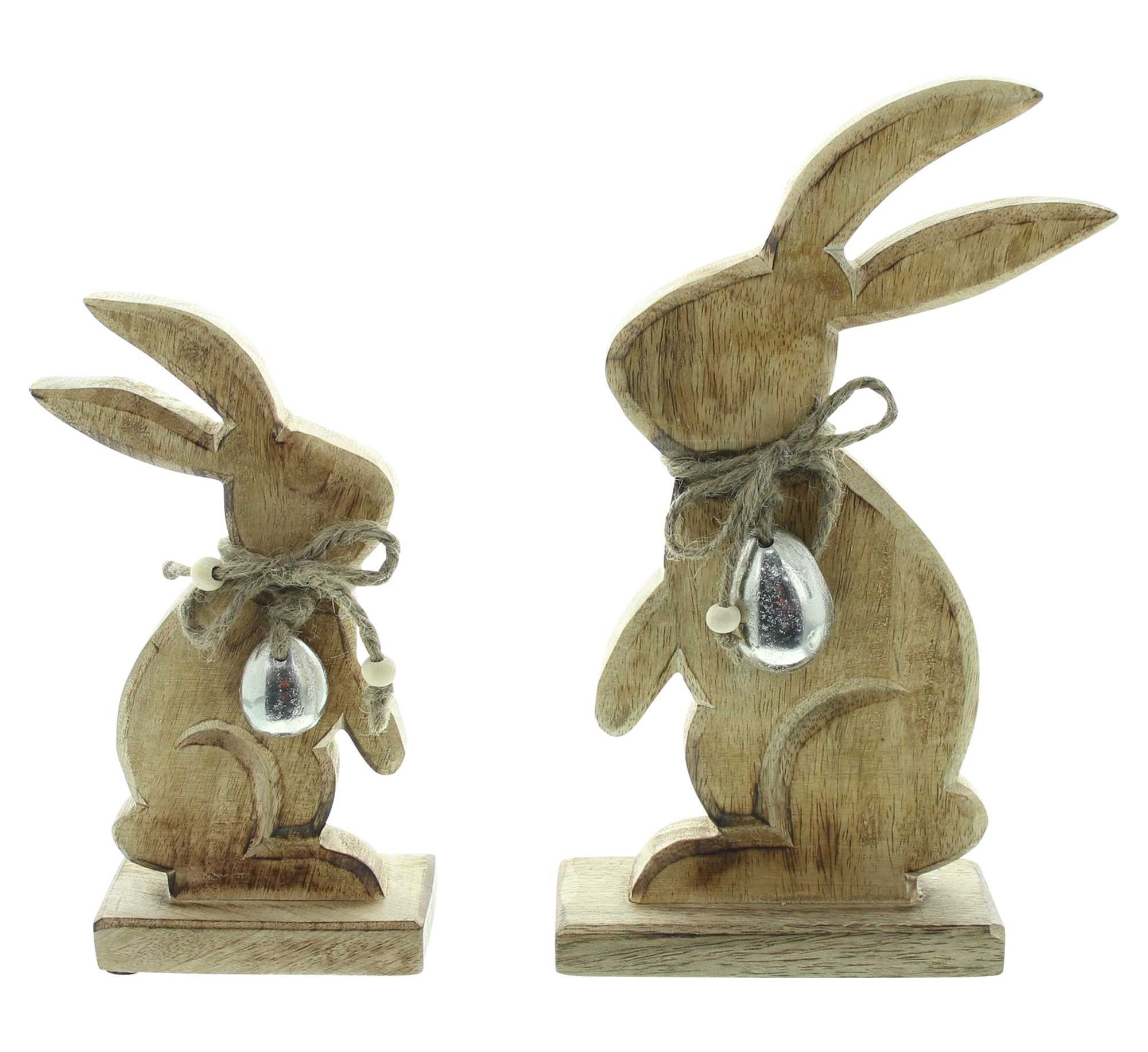 Gefertigt aus naturbelassenem Mangoholz, bestechen die Dekohasen durch ihre warme Holzmaserung und die hochwertige Verarbeitung. Ein besonderes Highlight ist der eiförmige Anhänger aus Aluminium mit Antikfinish, der an einer rustikalen Jutekordel befestigt ist und den natürlichen Look stilvoll ergänzt.