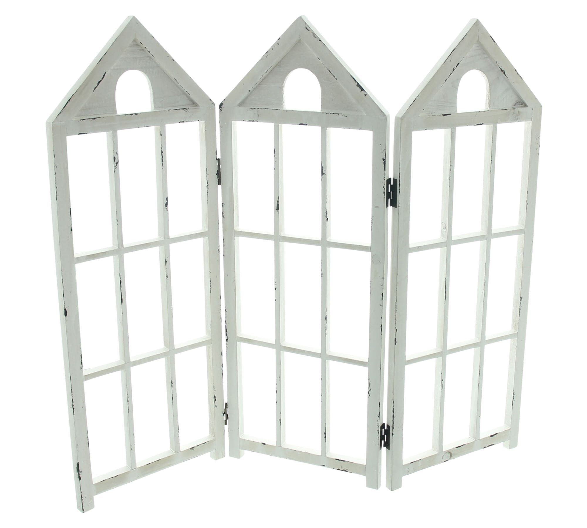 Der Paravent ist aus weiß lackiertem Holz gefertigt und überzeugt durch seine detailreiche Gestaltung mit fensterartigen Aussparungen und spitz zulaufenden Giebeln. Die bewusst gesetzten Gebrauchsspuren verleihen ihm den charakteristischen Vintage-Charme, der den Shabby Chic so besonders macht.