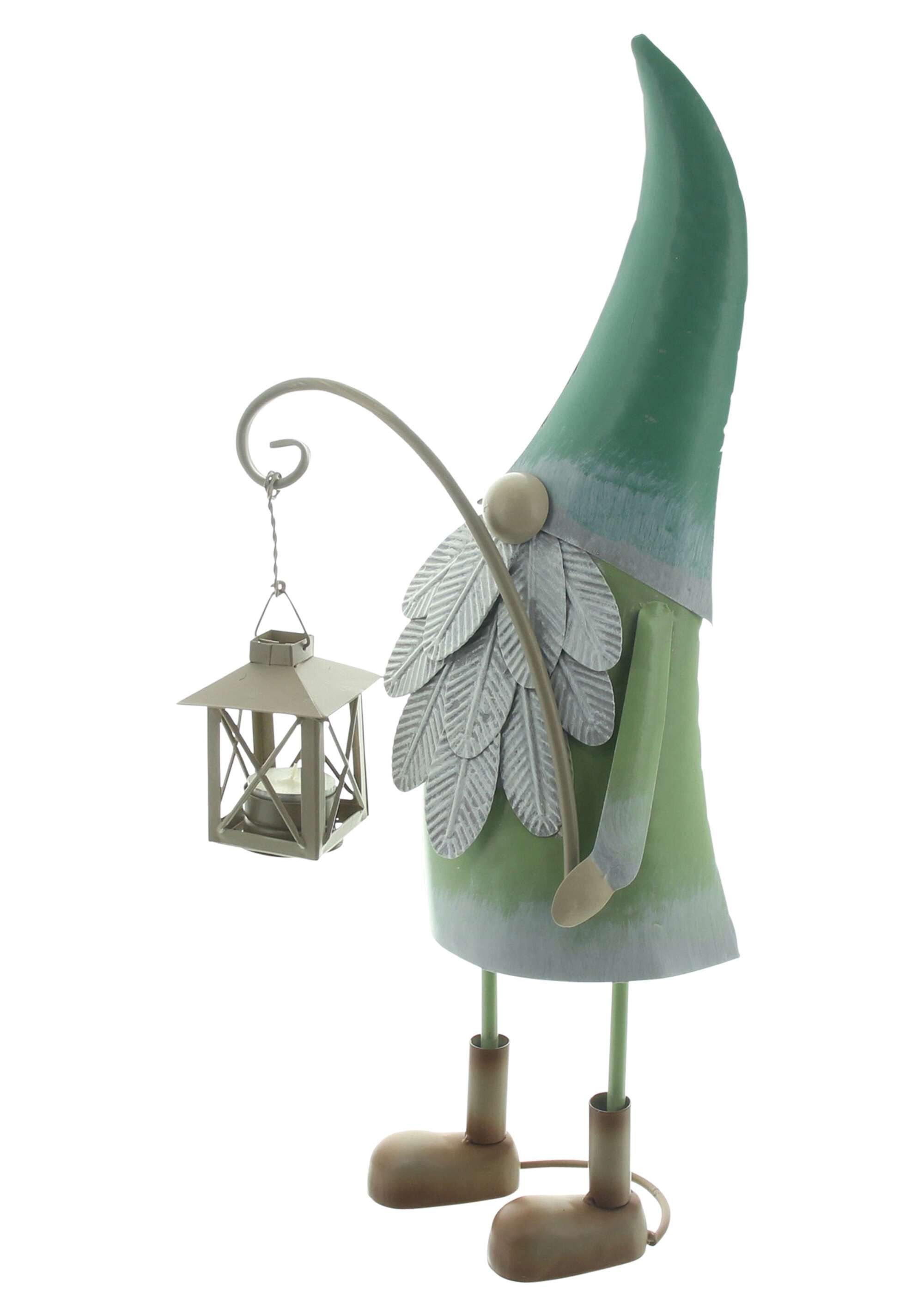 Gefertigt aus robustem Metall und beidseitig in sanften Grün- und Brauntönen lackiert, fügt sich der Gnom harmonisch in natürliche Umgebungen ein – sei es auf dem Balkon, der Terrasse oder als dekoratives Highlight im Innenbereich. Die detailreiche Gestaltung mit seiner spitzen Mütze, den aufwendig gearbeiteten Blättern und den charakteristischen Stiefeln macht ihn zu einem wahren Blickfang.