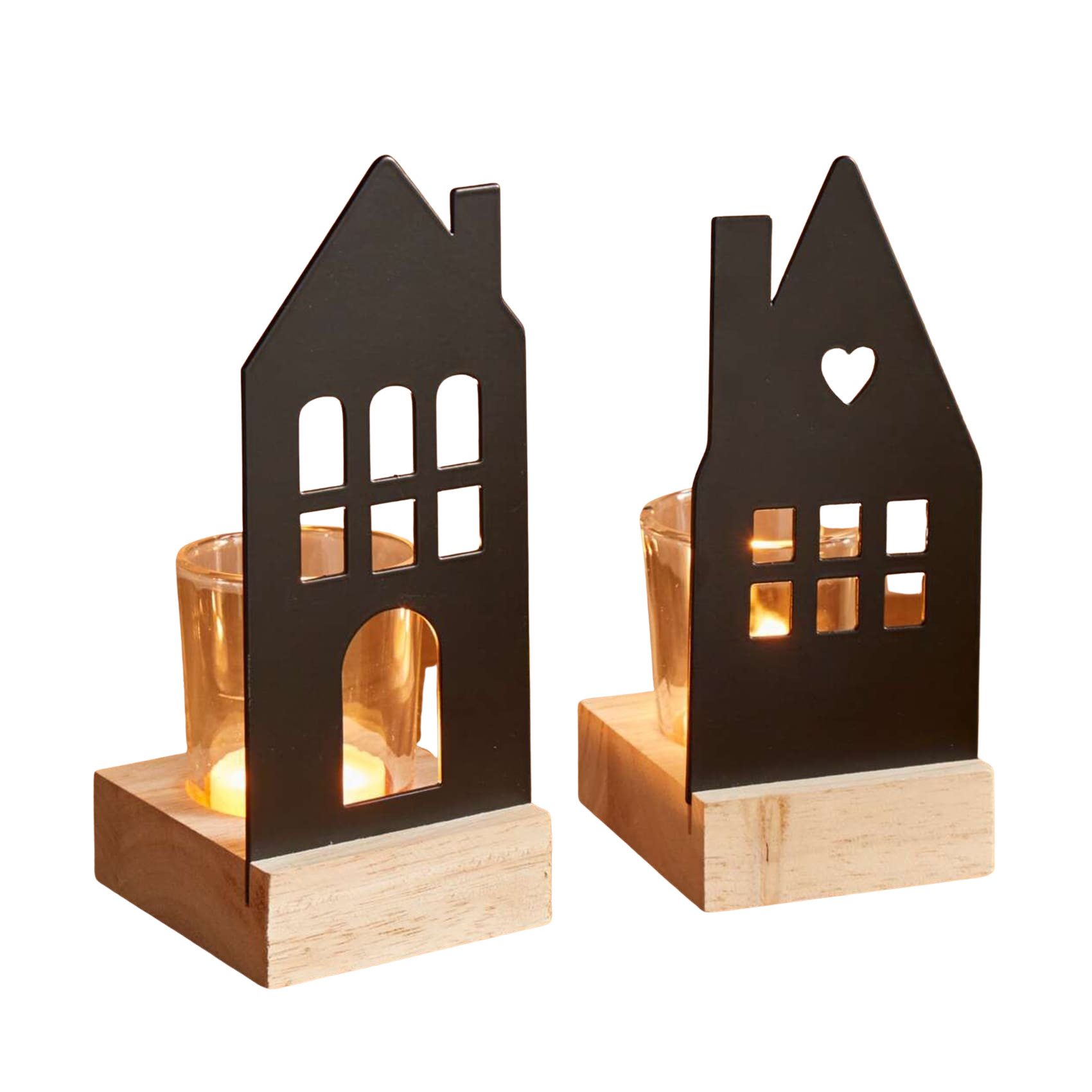 Jedes Kerzenhalter besteht aus einer mattschwarz lackierten Metallsilhouette in Form eines stilisierten Hauses. Die filigranen Aussparungen in Form von Fenstern, Türen und einem kleinen Herz erzeugen zauberhafte Licht- und Schattenspiele, sobald ein Teelicht im Inneren entzündet wird. Besonders in den Abendstunden entsteht ein einladender, wohnlicher Effekt – ideal für Fensterbänke, Sideboards oder festlich gedeckte Tische.