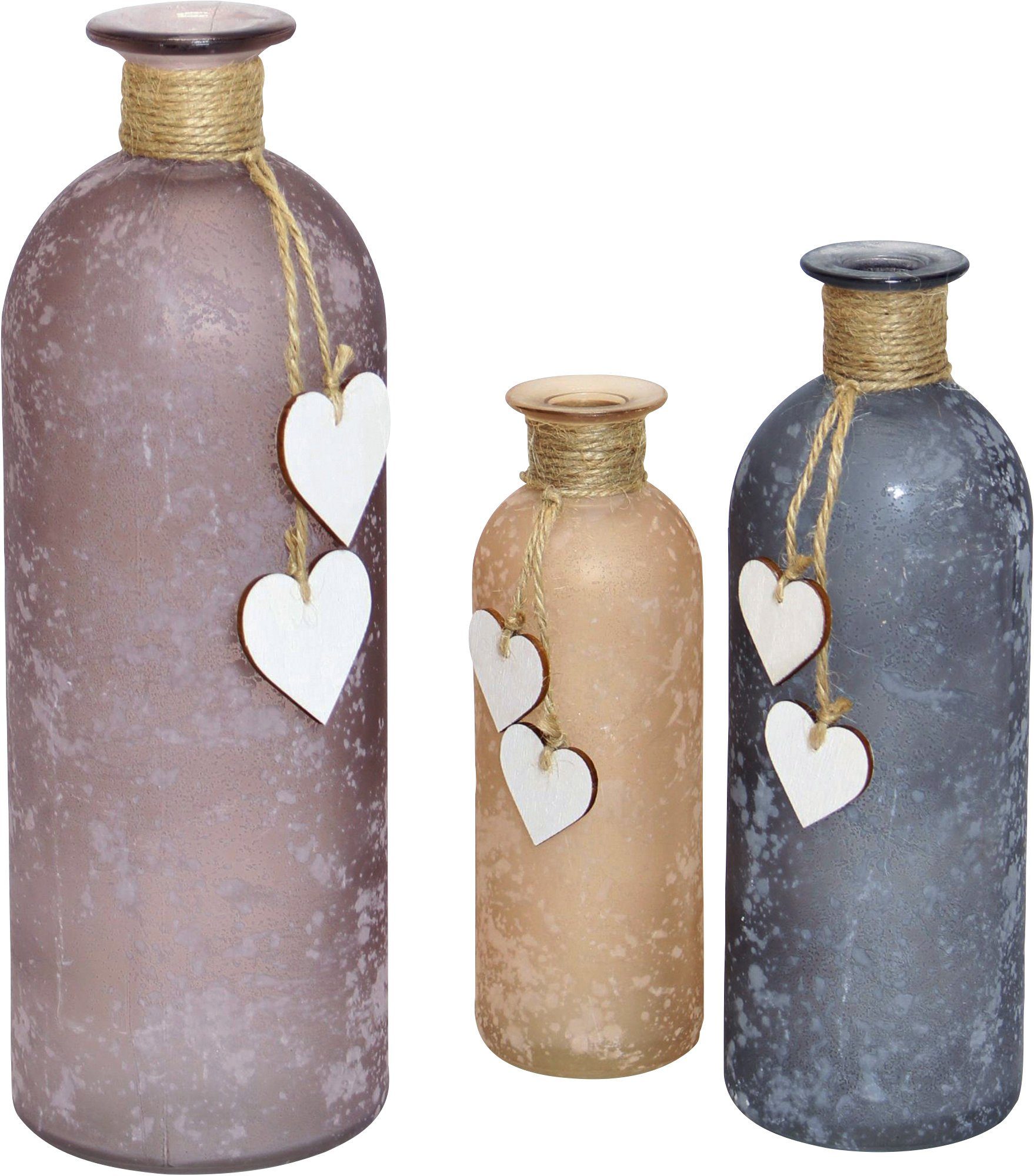 Vase im 3er-Set. Ein zauberhaftes Accessoire, das frische oder getrocknete Blumen und Gräser wunderschön arrangiert. Herzchen verleihen ihm einen romantischen Touch. Die Glasvasen in sanften Farben und unterschiedlichen Größen sind mit einer Sisalschnur und Holzherzchen dekoriert. Aus satiniertem Glas mit weißen Sprenkeln.