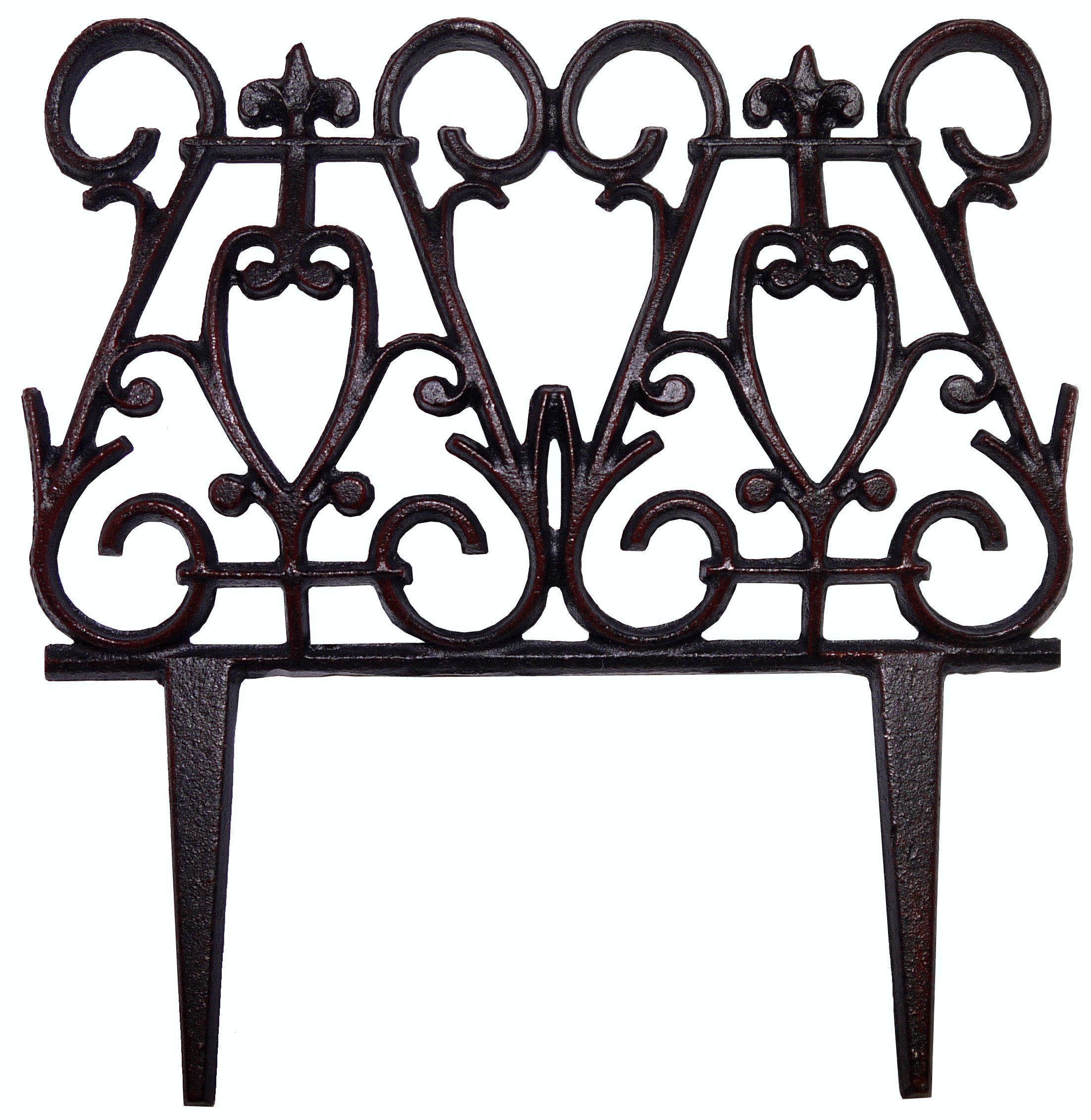 Dieser Zaun ist leicht gebogen und besteht aus brüniertem Gusseisen.