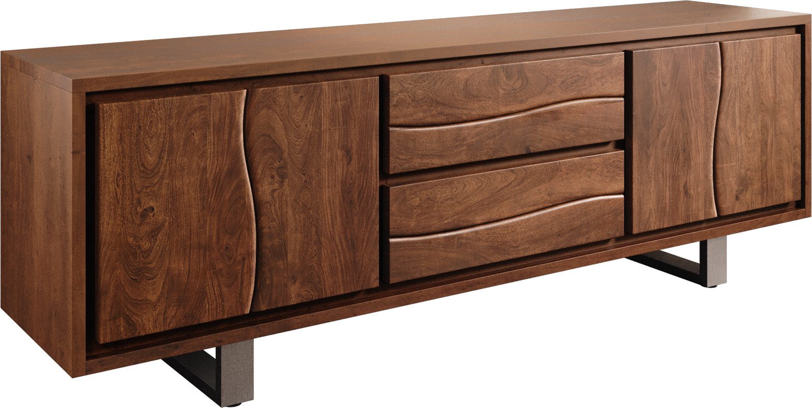 Der moderne Fernsehtisch Live-Edge wird aus hochwertigem, massivem Akazienholz gefertigt. Bei diesem TV-Tisch kommt die natürliche Maserung der Akazie besonders zur Geltung.