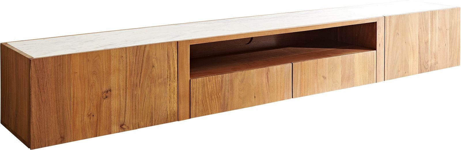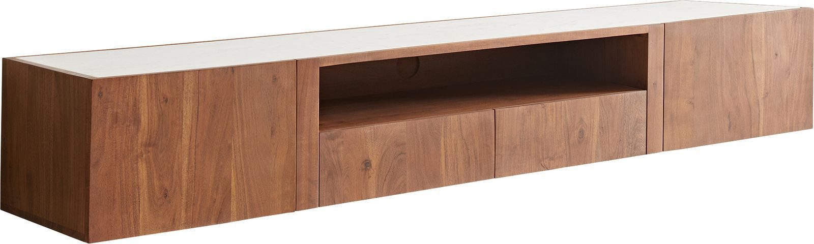 Das Lowboard Secara beeindruckt durch seine großzügigen Maße und das einmalig geradlinige Design. Gefertigt wurde der schöne Fernsehtisch aus dem besonders harten Holz der Akazie, das in einen einladenden Braunton gehüllt wurde. Eine wertvolle Marmorplatte vervollständigt das Designmöbelstück und veredelt den einmaligen Look auf besondere Weise.