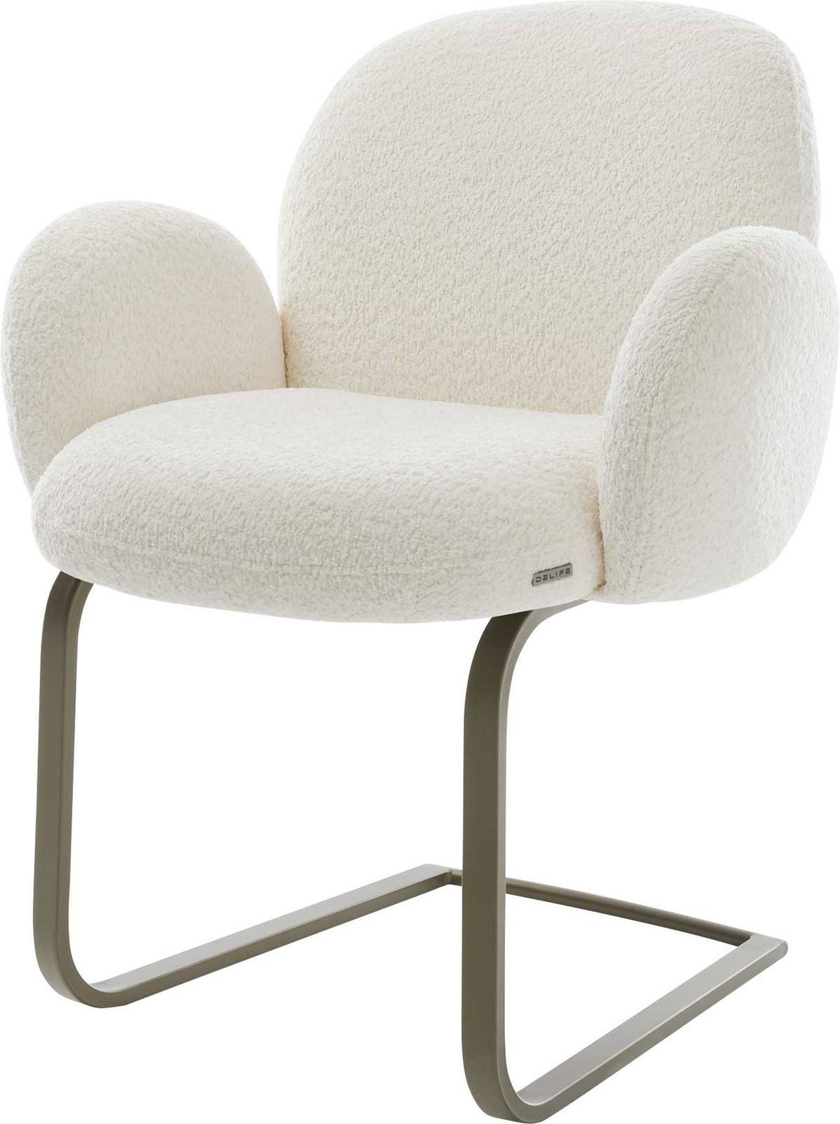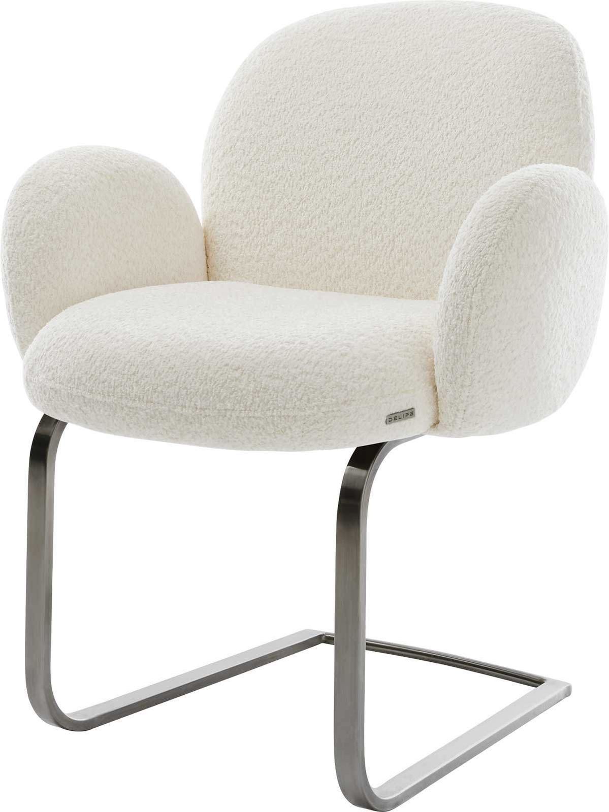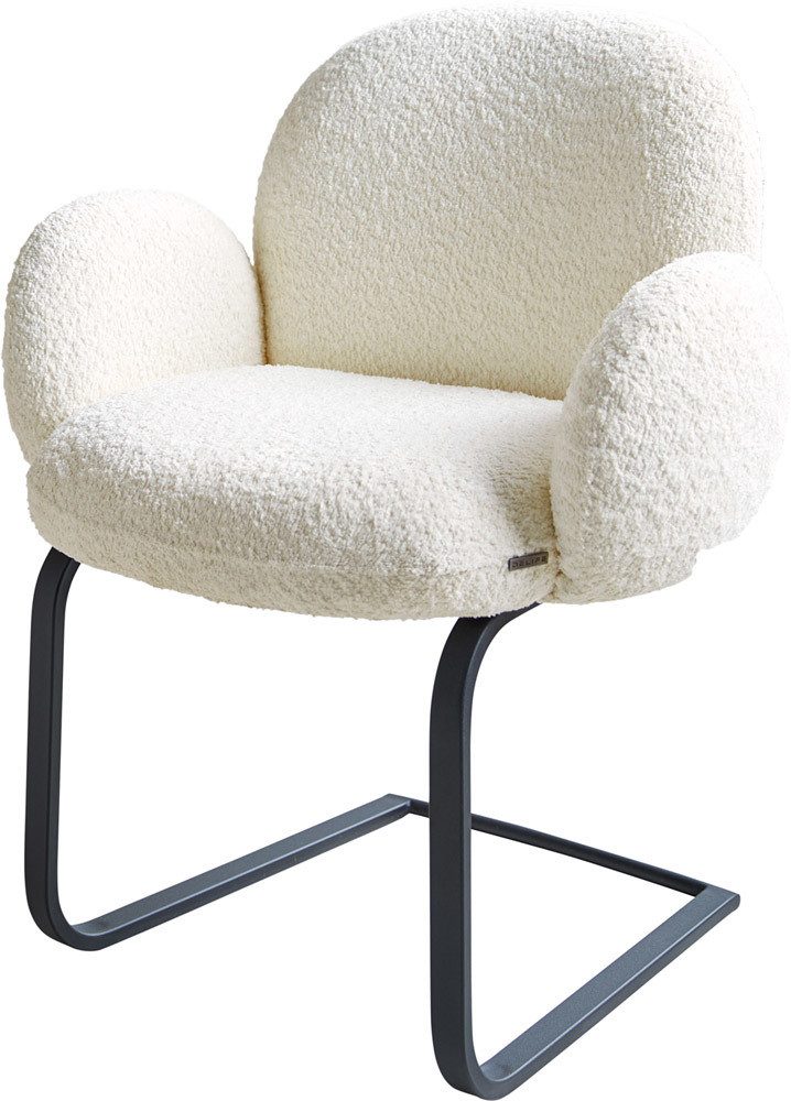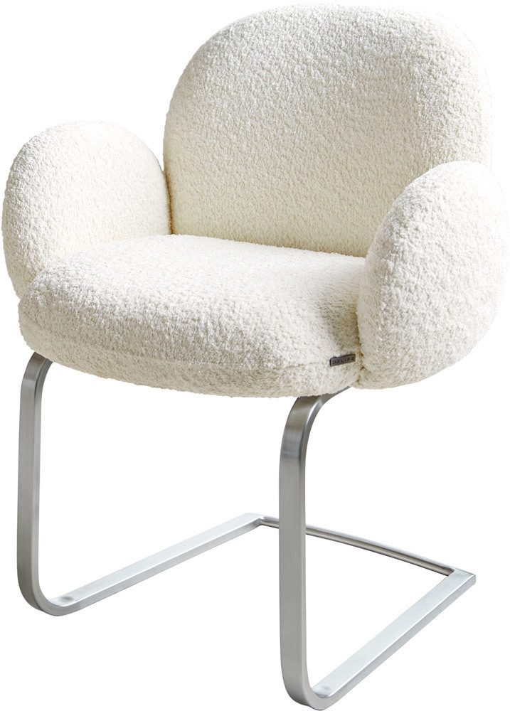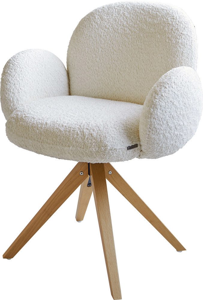 Der Esszimmerstuhl wurde mit einem besonders weichen und pflegeleichten Bouclé Stoff bezogen, der sich in einem warmen Weiß präsentiert und dem Esszimmer einen eleganten Look verleiht.