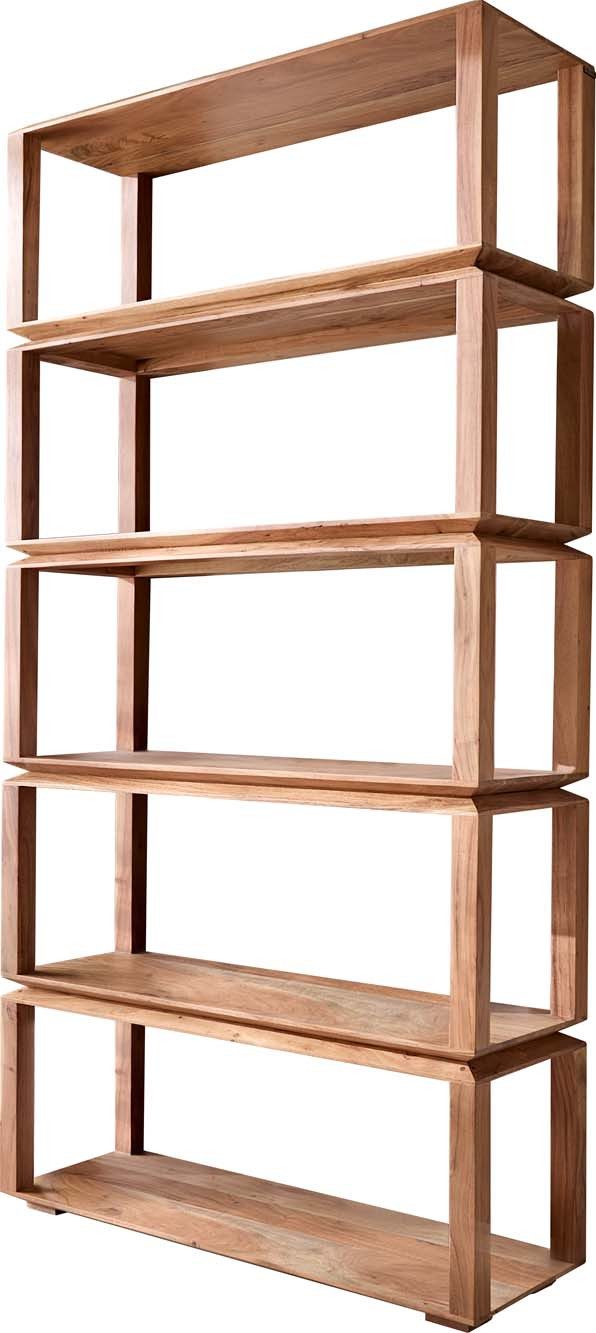 Mit dem Regal Sakura in Akazie Natur bringst du ein Stück Natur in dein Zuhause. Das Design spielt mit der Schönheit der natürlichen Holzmaserung und lässt jedes Fach wie aufeinandergestapelt wirken – ein echtes Highlight für Individualisten und Freunde des modernen Einrichtungsstils. Die warme Akazie verleiht deinem Raum eine einladende und gemütliche Atmosphäre und sorgt gleichzeitig für einen robusten und langlebigen Charakter. Dank der fünf großzügigen Fächer bietet dir das Regal Sakura genügend Stauraum für Bücher, Deko-Objekte oder Pflanzen und setzt diese auf kreative Weise in Szene.