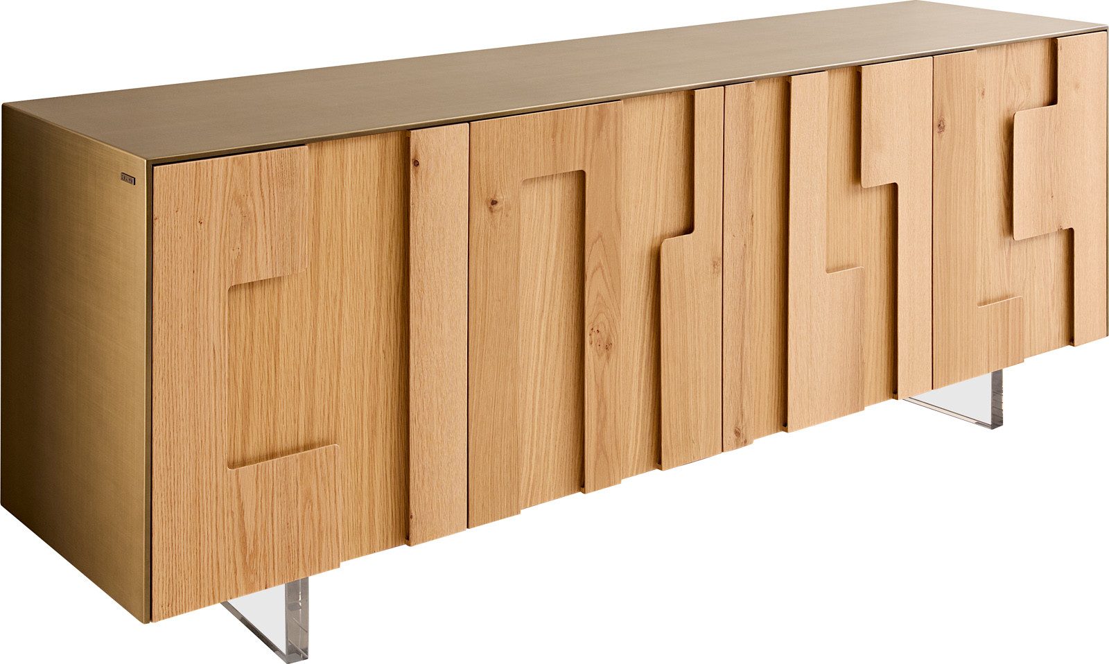Die seitlichen Flächen sowie die Ablagefläche oben sind in einem eleganten Metallic-Gold brushed lackiert und verleihen dem Sideboard eine edle, glamouröse Note. Dieser Kontrast zur natürlichen Holzfront sorgt für ein spannendes Zusammenspiel aus Material und Farbe. Ob als Highlight im Wohnraum oder stilvoller Stauraum im Essbereich – Taka vereint Funktionalität mit hochwertigem Design auf beeindruckende Weise.