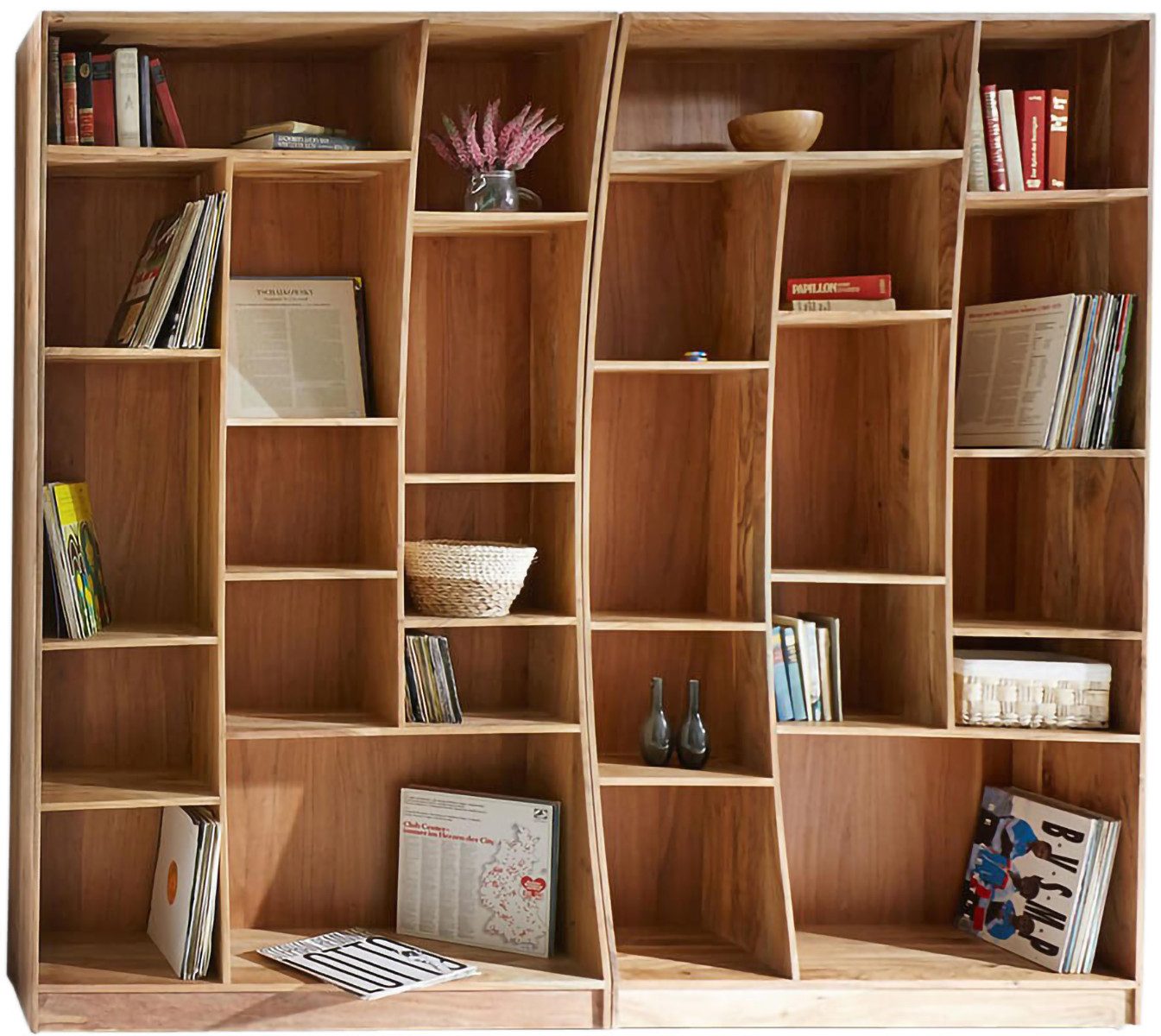Charakteristische Risse, Astlöcher und Einschlüsse machen jedes Holzregal zu einem Unikat. Das Bücherregal besteht aus einem 2-er Set und kann einzeln oder zusammen aufgestellt werden. Ausgestattet mit zahlreichen, offenen Fächern bietet das Regal viel Platz für Bücher und Dekoration.