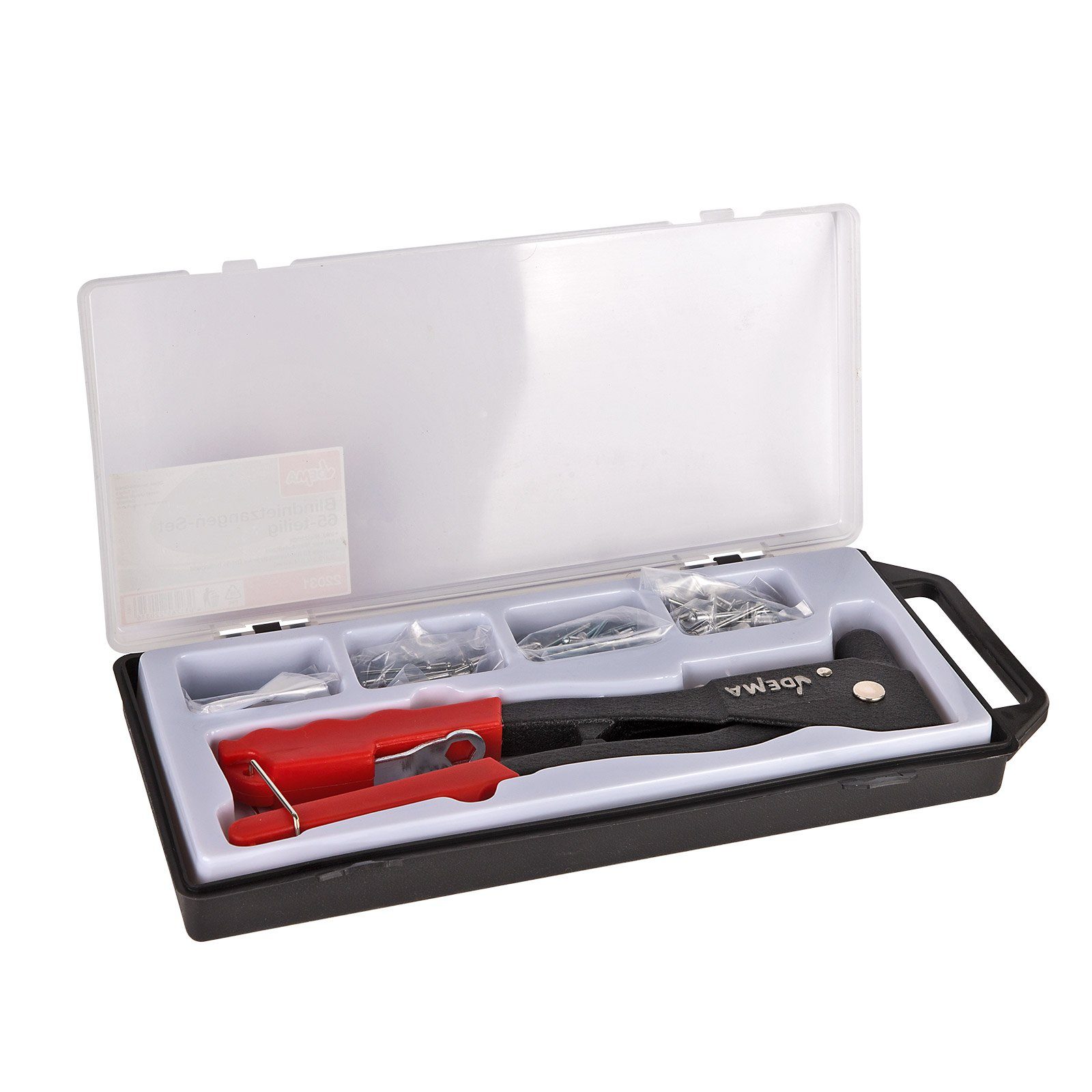Nietarbeiten leicht gemacht. Ideal für alle anfallenden kleineren Nietarbeiten im Hobby- und Handwerksbereich. Das Komplettset beinhaltet schon alles, um sofort loslegen zu können. Auswechselbare Köpfe für unterschiedliche Dorne machen die Verwendung noch vielseitiger.