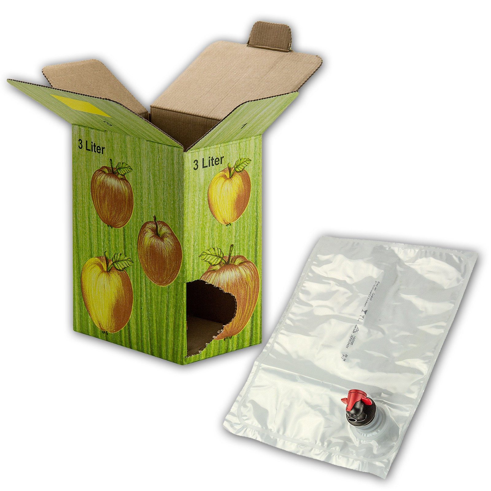 Die Bag-in-Box-Beutel mit Auslaufhahn und Karton mit Apfeldekor sind eine günstige und praktische Alternative zu schweren Flaschen oder Kunststoff-Fässern!