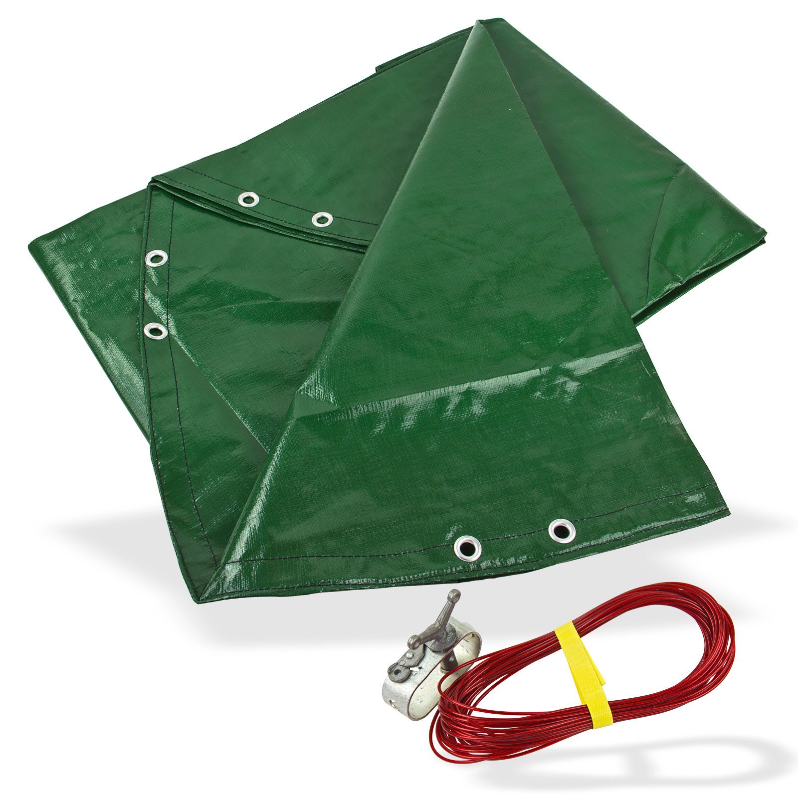 Zudem hat sie, im Gegensatz zu anderen Planen, alle 60 cm eine Metallöse + einen Drahtseil und Spannvorrichtung zur Fixierung