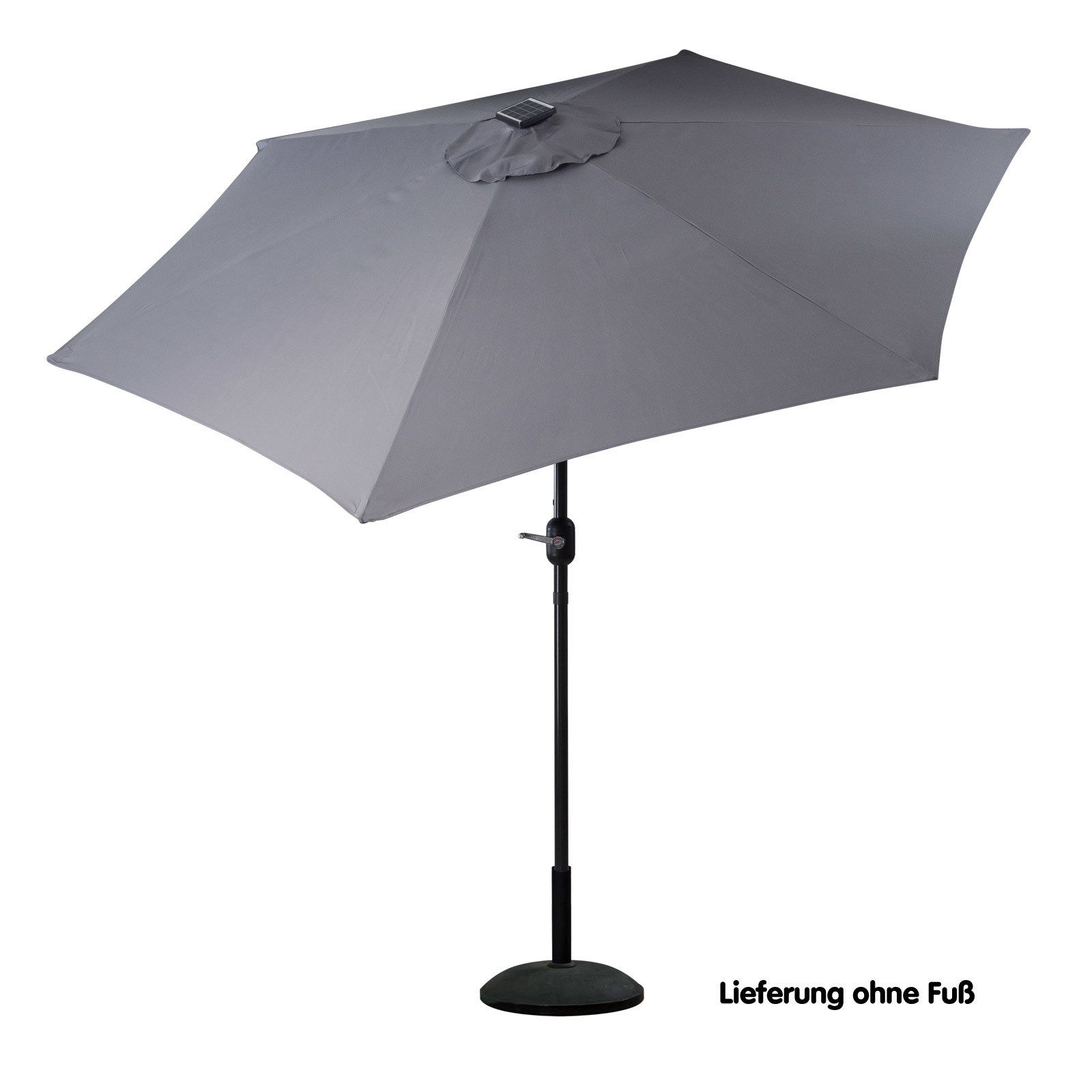 Sehr schöner Garten-Sonnenschirm mit 2,70 Meter Durchmesser und effektvoller LED Beleuchtung. Da macht das Feiern oder Relaxen gleich doppelt so viel Freude. Und das Sie auch noch draußen sitzen können, wenn die Sonne schon längst untergegangen ist, sind in den Streben insgesamt 24 LED Lämpchen verbaut, welche Ihnen dann - auf Knopfdruck - eine super Atmosphäre zaubern.