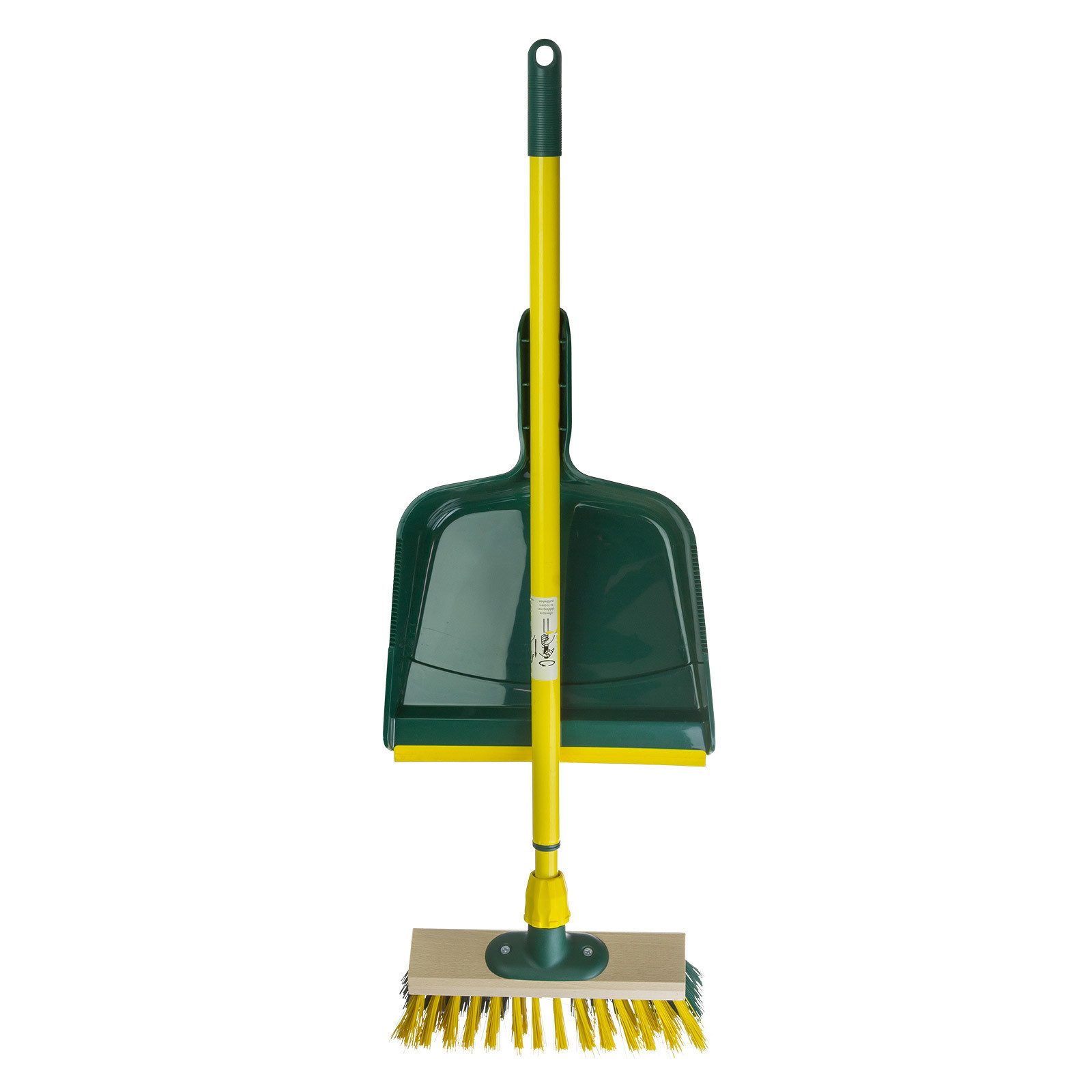 Original BÜMAG Kehrset mit 25 cm Straßenbesen, 2 farbiger Beborstung und aufgeklickter, großer Schaufel. Über den Teleskopstiel können Sie zudem die ideale Длина für unterschiedliche Körpergrößen einstellen, und falls es mal ein anderer Stiel sein soll - kein Problem. Durch die Normverschraubung mit Überwurfmutter passen auch andere Stiele.