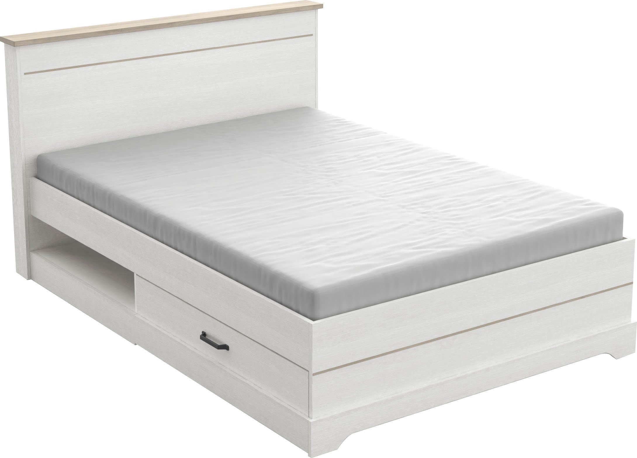 Das Stauraumbett im schönen Landhausstil setzt romantische Akzente. Die Schubladen und Regale sorgen für reichlich Stauraum und sehen durch ihre Griffe sehr edel aus. Die Melaminbeschichtung macht diese Bett zu einem leicht zu reinigendem Möbelstück. In der Serie gibt es als Ergänzung noch weitere Möbelstücke, die zusammen ein perfektes Zimmer ergeben.