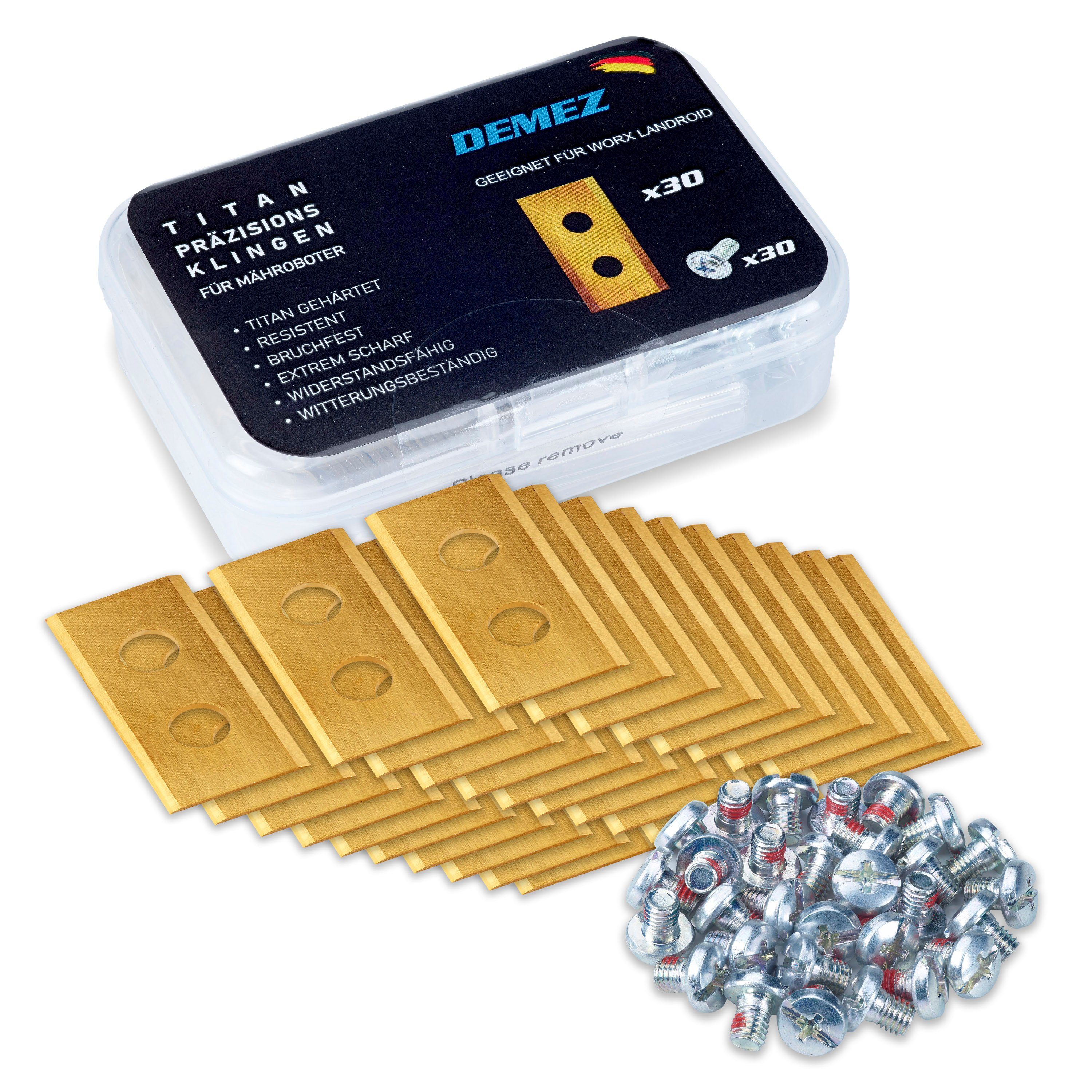 SCHARFE MÄHROBOTERMESSER & GLEICHMÄßIGER RASEN - KEIN PROBLEM MIT DEMEZ MÄHROBOTERKLINGEN! Oft gesehen und jedes mal auf's Neue geärgert: Der heilige Rasen ist nicht eben und/oder Grashalme sind nicht geschnitten sondern abgerissen. Weder schön für das Auge noch gut für deine Grünfläche, da die obere Kante der Grashalme anfangen sich grau zu färben. Von nun an nicht mehr - Mit unserem Vorteilspaket von Demez Mähroboterklingen im 30er Set sind gerader und saftig grüner Rasen vorprogrammiert. Unsere titanbeschichteten Mähroboterklingen sind resistent, bruchfest, extrem scharf, widerstandsfähig und witterungsbeständig. Durch die Titanbeschichtung der Messer, ist eine rasiermesserscharfe und langlebige Haltedauer zum Mähen gegeben. Damit wir unseren Kundenanforderungen gerecht werden und nur Klingen in höchster Qualität ausliefern, wurden unsere Ersatzmesser für Mähroboter auf Herz und Niere vom TÜV Rheinland geprüft. Wie erwähnt, bieten wir unsere Ersatzklingen für Mähroboter im 30er Pack, damit genügend Messer für die kommenden Mähsaisons gewährleistet sind.
