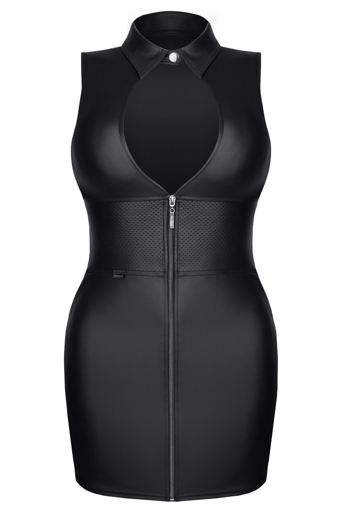 Schwarzes Wetlook kleid im Militärstil. Der runde Ausschnitt vorne bringt das Dekolleté wunderschön zur Geltung. Von der unteren Brustlinie bis zur unteren Taille, rundherum Wetlook mit Nadelloch-Stoffeinsätzen. Es betont die Taille auf unglaublich Art und Weise. Vorne befindet sich außerdem ein dekorativer Reißverschluss. Der Reißverschluss ist mit einem eingravierten Demoniq-Logo versehen. Es hat eine dekorative Funktion, erleichtert aber auch das Anziehen des Kleides. Der untere Teil des Kleides betont sehr, sehr attraktiv die Form der Hüfte und des Gesäßes.Modell auf dem Foto: 164 cm groß.Produktgröße: S