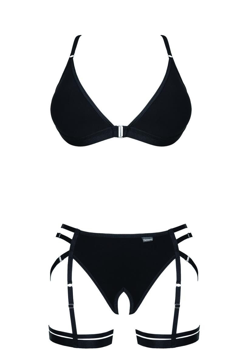 Schwarzes knappes Frauen Dessous Reizwäsche Set BH und ouvert String mit integriertem Strumpfhaltern, gefertigt aus dehnbarem Stoff und verstellabren Gummibänder. Der BH lässt sich vorne öffnen.